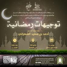 إدارة الدعوة والإرشاد بفرع وزارة الشؤون الإسلامية بعسير بالتعاون مع جمعية الدعوة وتوعية الجاليات بخميس مشيط دعوتكم لحضور الدرس التالي توجيهات رمضانية لفضيلة الشيخ : أحمد بن سعيد الشهراني يومياً لفترة شهر رمضان بجامع تانة بحي العمارة بعد صلاة… المزيد