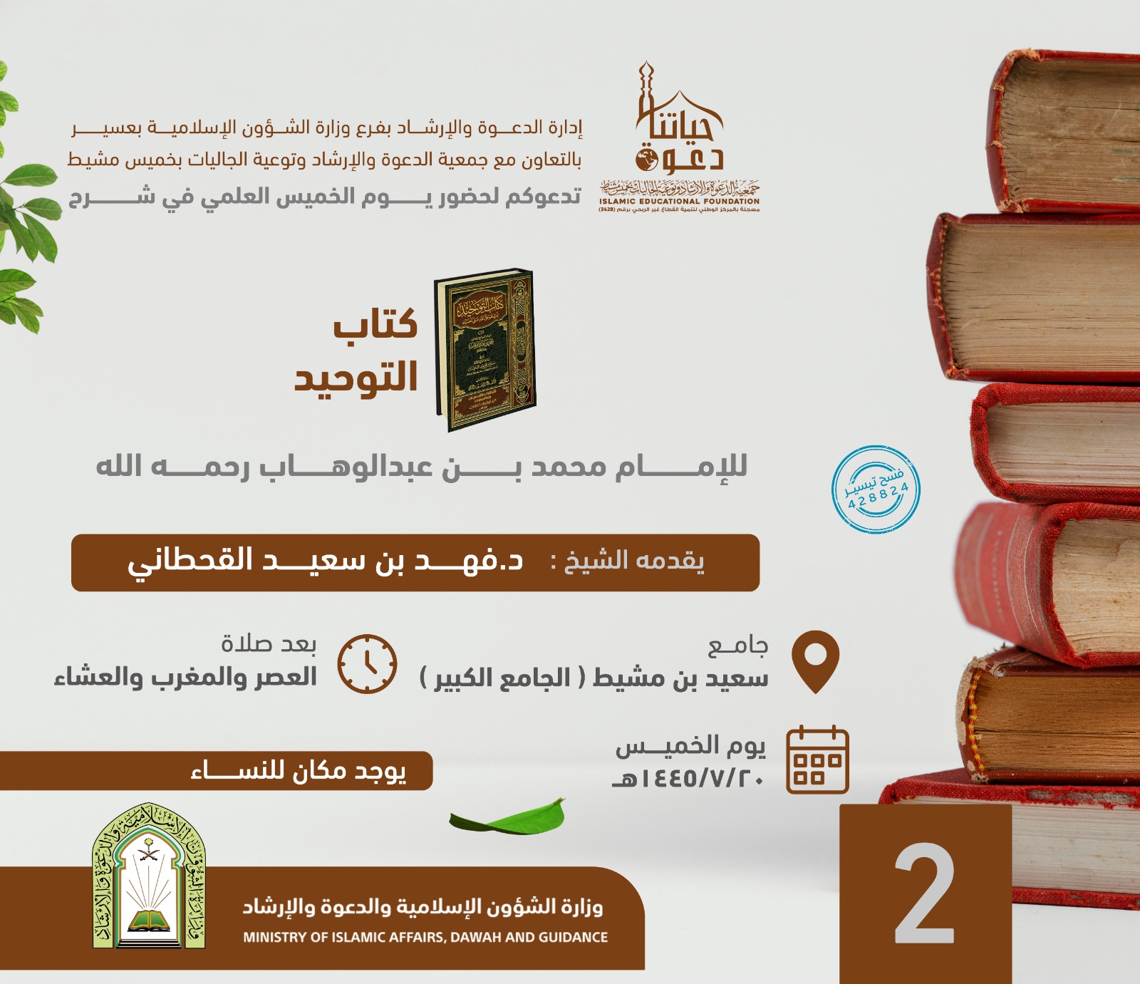 إدارة الدعوة بفرع وزارة الشؤون الإسلامية بعسير بالتعاون مع جمعية الدعوة بخميس مشيط دعوتكم لحضور محاضرة في شرح كتاب التوحيد للإمام محمد بن عبدالوهاب رحمه الله يقدمها الشيخ : د. فهد بن سعيد القحطاني بجامع سعيد بن مشيط (الجامع الكبير) بعد صلاة العصر والمغرب والعشاء يوم الخميس 20/ 7/ 1445ه (يوجد مكان للنساء).