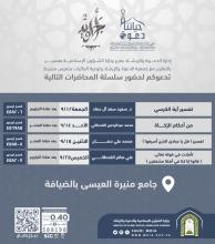 محاضرةإدارة الدعوة والإرشاد بفرع وزارة الشؤون الإسلامية بعسير بالتعاون مع جمعية الدعوة وتوعية الجاليات بخميس مشيط دعوتكم لحضور سلسلة الكلمات التالية : |