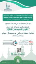 يسر إدارة الدعوة بفرع وزارة الشؤون الإسلامية بعسير بالتعاون مع جمعية الدعوة وتوعية الجاليات بخميس مشيط تدعوكم لحضور محاضرة بعنوان شرح قول النبي صلى الله عليه وسلم "تقوى الله وحسن الخلق" يقدمها الشيخ: سعد بن حابي بن محمد آل بسام  بجامع شيخ الإسلام… المزيد