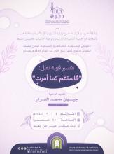 إعلان محاضرةيسر إدارة الدعوة والإرشاد بفرع وزارة الشؤون الإسلامية بمنطقة عسير بالتعاون مع جمعية الدعوة والإرشاد وتوعية الجاليات بمحافظة خميس مشيط دعوتكنّ لمتابعة المحاضرة النسائية بعنوان تفسير قوله تعالى"فاستقم كما أمرت" تقديم الداعية: جيهان محمد السراج يوم… المزيد |