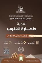 إعلان محاضرةيسر إدارة الدعوة بفرع وزارة الشؤون الإسلامية بعسير بالتعاون مع جمعية الدعوة وتوعية الجاليات بخميس مشيط تدعوكم لحضور محاضرة بعنوان أهمية طهارة القلب يقدمها الشيخ: ظافر بن شتوي القحطاني بجامع تانة بحي العمارة يوم الاثنين 10/ 3/ 1445هـ بعد صلاة… المزيد |