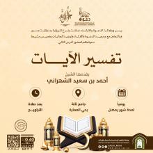 درس علميإدارة الدعوة والإرشاد بفرع وزارة الشؤون الإسلامية بعسير بالتعاون مع جمعية الدعوة وتوعية الجاليات بخميس مشيط دعوتكم لحضور الدرس التالي تفسير الآيات لفضيلة الشيخ : أحمد بن سعيد الشهراني يومياً لفترة شهر رمضان بجامع تانة بحي العمارة بعد صلاة… المزيد |