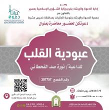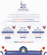 إعلان سلسلة محاضراتيسر إدارة الدعوة والإرشاد بفرع وزارة الشؤون الإسلامية بمنطقة عسير بالتعاون مع جمعية الدعوة والإرشاد وتوعية الجاليات بمحافظة خميس مشيط دعوتكنّ لحضور سلسلة المحاضرات التالية: |