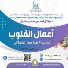 إعلان سلسلة محاضراتيسر إدارة الدعوة والإرشاد بفرع وزارة الشؤون الإسلامية بمنطقة عسير بالتعاون مع جمعية الدعوة والإرشاد وتوعية الجاليات بمحافظة خميس مشيط دعوتكم لحضور سلسلة المحاضرات التالية: |