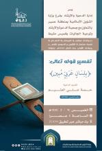 إعلان محاضرةيسر إدارة الدعوة والإرشاد بفرع وزارة الشؤون الإسلامية بمنطقة عسير بالتعاون مع جمعية الدعوة والإرشاد وتوعية الجاليات بمحافظة خميس مشيط دعوتكنّ لمتابعة المحاضرة النسائية بعنوان تفسير قوله تعالى : ( بِلِسَانٍ عَرَبِيٍّ مُبِينٍ ) تقديم… المزيد |