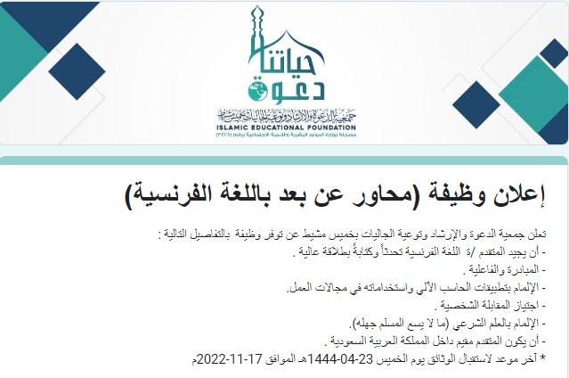تعلن جمعية الدعوة والإرشاد وتوعية الجاليات بخميس مشيط عن توفر وظيفة بالتفاصيل التالية :