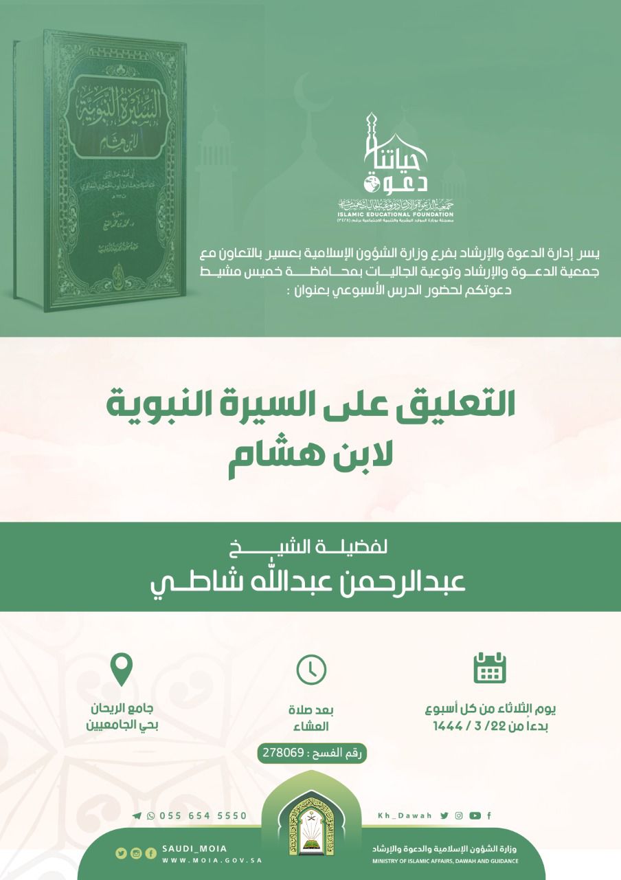 يسر إدارة الدعوة والإرشاد بفرع وزارة الشؤون الإسلامية بمنطقة عسير بالتعاون مع جمعية الدعوة والإرشاد وتوعية الجاليات بمحافظة خميس مشيط دعوتكم لحضور الدرس الأسبوعي بعنوان التعليق على السيرة النبوية لابن هشام لفضيلة الشيخ عبدالرحمن عبدالله شاطي يوم الثلاثاء من كل أسبوع بدءاً من 22-03-1444هـ بعد صلاة العشاء في جامع الريحان بحي الجامعيين