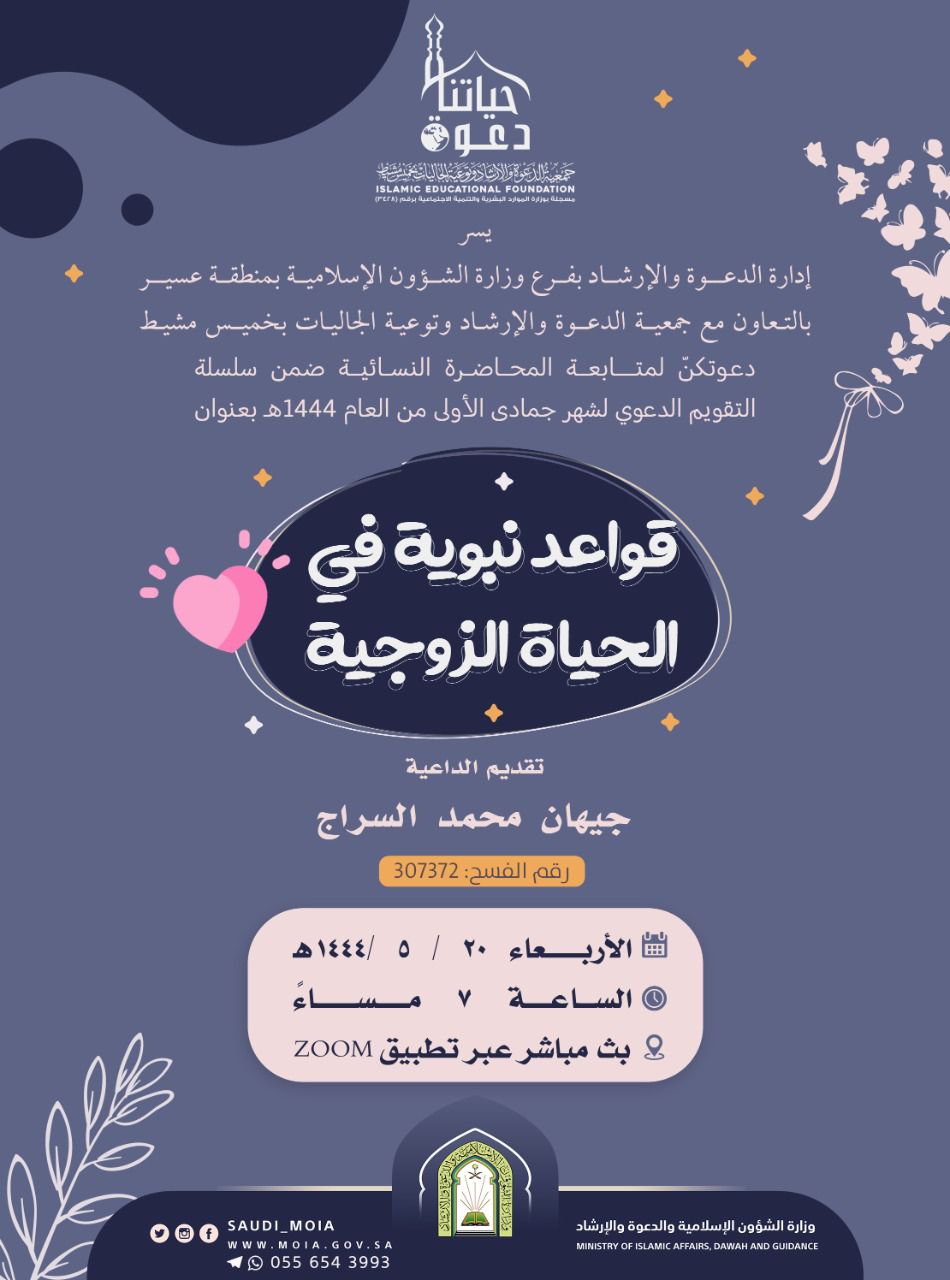 يسر إدارة الدعوة والإرشاد بفرع وزارة الشؤون الإسلامية بمنطقة عسير بالتعاون مع جمعية الدعوة والإرشاد وتوعية الجاليات بمحافظة خميس مشيط دعوتكنّ لمتابعة المحاضرة النسائية بعنوان قواعد نبوية في الحياة الزوجية تقديم الداعية جيهان محمد السراج يوم الأربعاء بتاريخ 20-05-1444هـ الساعة 7 مساءً بث مباشر عبر تطبيق الزوم