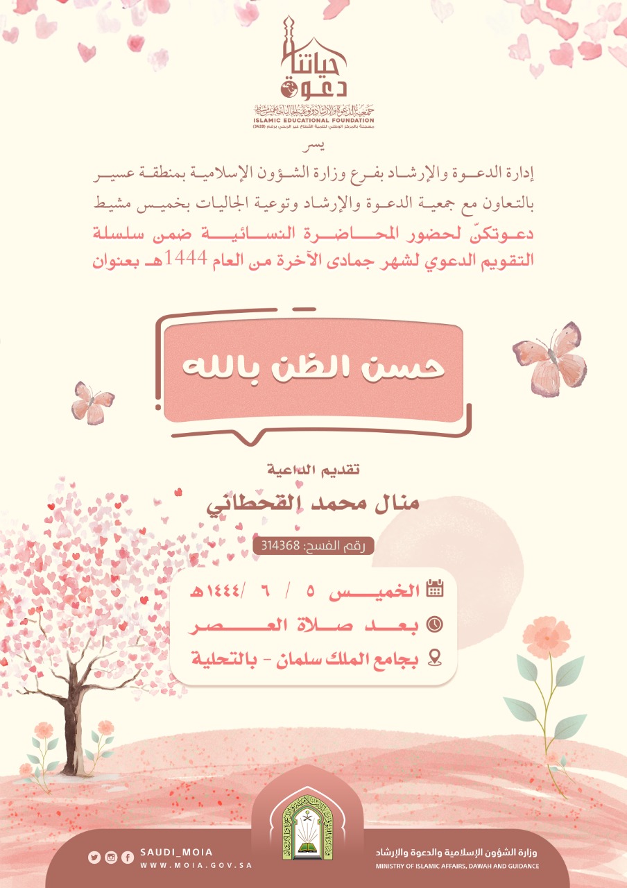 يسر إدارة الدعوة والإرشاد بفرع وزارة الشؤون الإسلامية بمنطقة عسير بالتعاون مع جمعية الدعوة والإرشاد وتوعية الجاليات بمحافظة خميس مشيط دعوتكنّ لمتابعة المحاضرة النسائية بعنوان حسن الظن بالله تقديم الداعية منال محمد القحطاني يوم الخميس بتاريخ 05-06-1444هـ بعد صلاة العصر بجامع الملك سلمان بحي التحلية