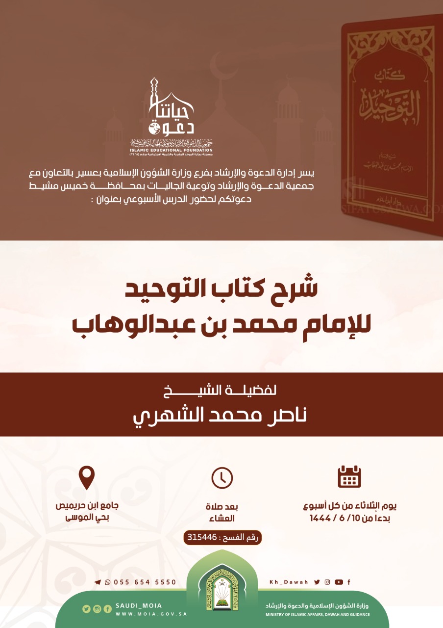 يسر إدارة الدعوة والإرشاد بفرع وزارة الشؤون الإسلامية بمنطقة عسير بالتعاون مع جمعية الدعوة والإرشاد وتوعية الجاليات بمحافظة خميس مشيط دعوتكم لحضور الدرس الأسبوعي بعنوان شرح كتاب التوحيد للإمام محمد بن عبدالوهاب لفضيلة الشيخ ناصر محمد الشهري يوم الثلاثاء من كل أسبوع بدءًا من 10-06-1444هـ بعد صلاة العشاء في جامع ابن حريميص بحي الموسى