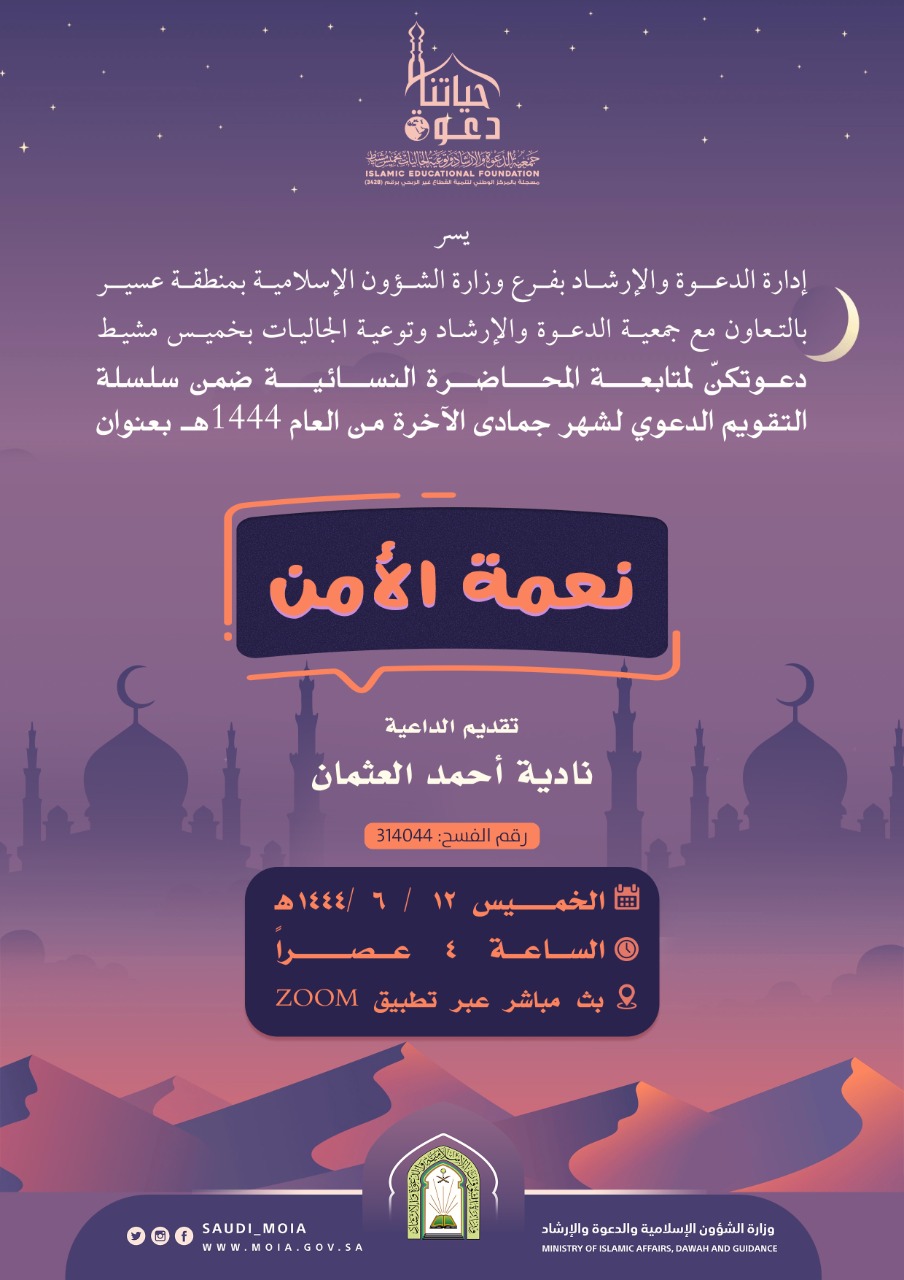 يسر إدارة الدعوة والإرشاد بفرع وزارة الشؤون الإسلامية بمنطقة عسير بالتعاون مع جمعية الدعوة والإرشاد وتوعية الجاليات بمحافظة خميس مشيط دعوتكنّ لمتابعة المحاضرة النسائية بعنوان نعمة الأمن تقديم الداعية نادية أحمد العثمان يوم الخميس بتاريخ 12-06-1444هـ الساعة الرابعة عصراً بث مباشر عبر تطبيق الزوم