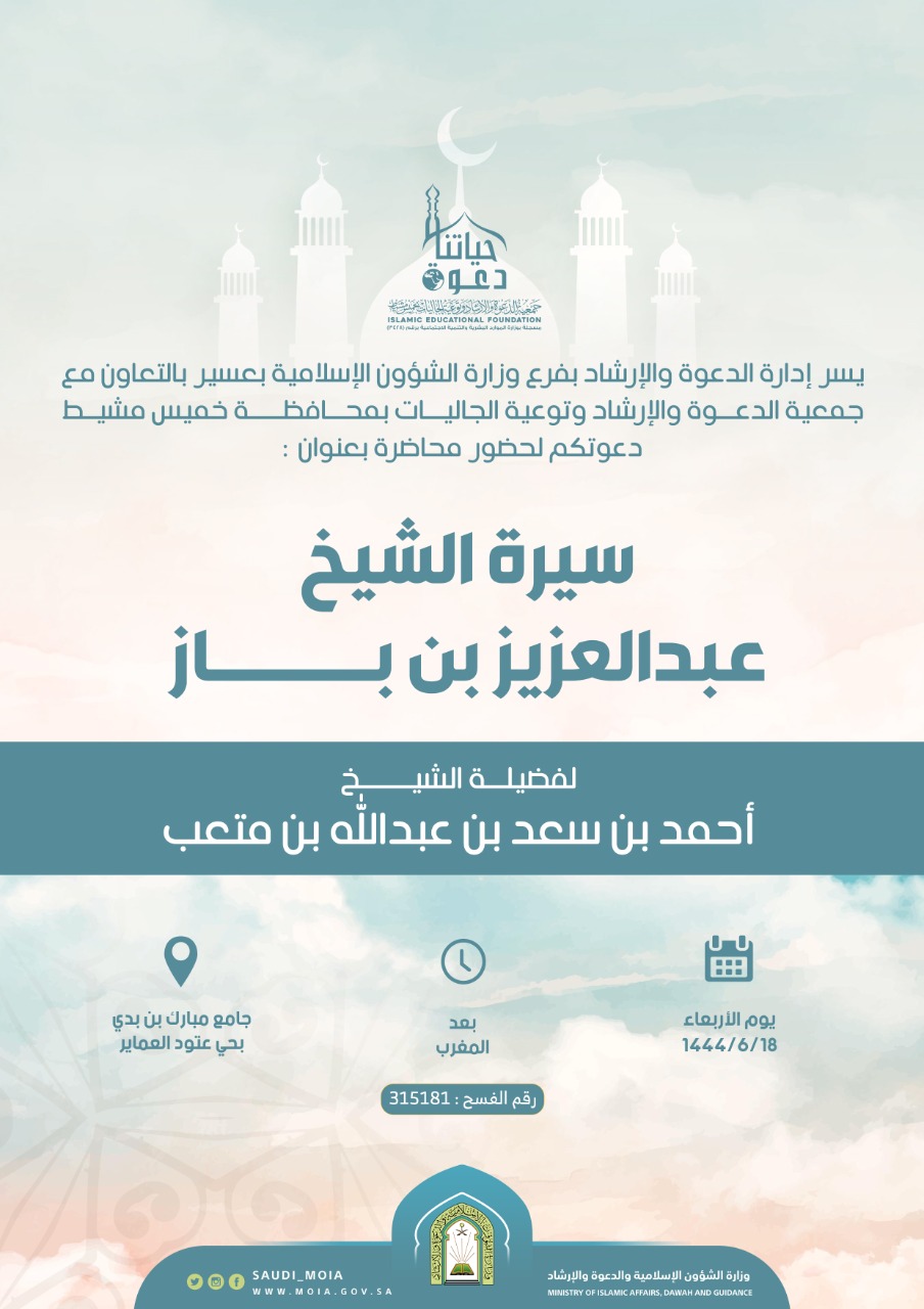 يسر إدارة الدعوة والإرشاد بفرع وزارة الشؤون الإسلامية بمنطقة عسير بالتعاون مع جمعية الدعوة والإرشاد وتوعية الجاليات بمحافظة خميس مشيط دعوتكم لحضور محاضرة بعنوان سيرة الشيخ عبدالعزيز بن باز لفضيلة الشيخ احمد بن سعد بن عبدالله بن متعب يوم الثلاثاء 18-06-1444هـ بعد صلاة المغرب في جامع مبارك بن بدي بحي عتود العماير