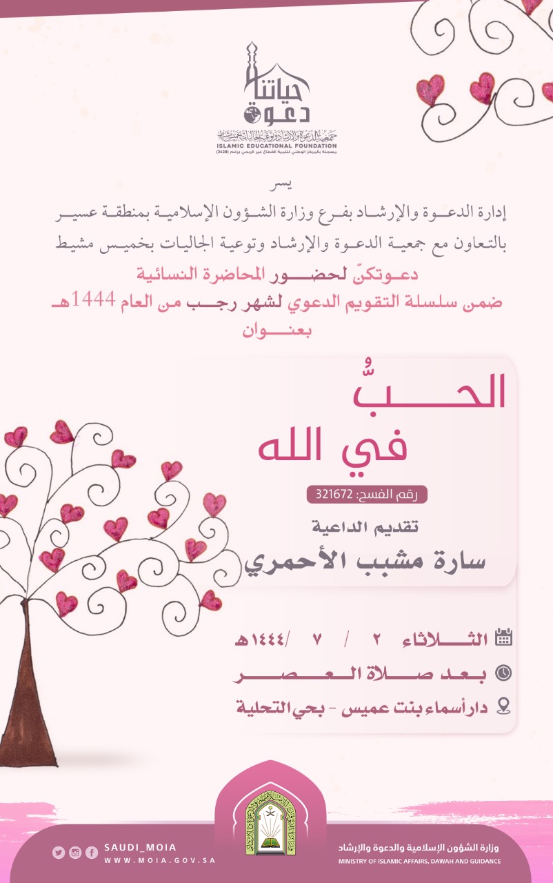 يسر إدارة الدعوة والإرشاد بفرع وزارة الشؤون الإسلامية بمنطقة عسير بالتعاون مع جمعية الدعوة والإرشاد وتوعية الجاليات بمحافظة خميس مشيط دعوتكنّ لحضور المحاضرة النسائية بعنوان الحب في الله للداعية سارة مشبب الأحمري يوم الثلاثاء بتاريخ 2 -7 - 1444هـ بعد صلاة العصر في دار أسماء بنت عميس بحي التحلية