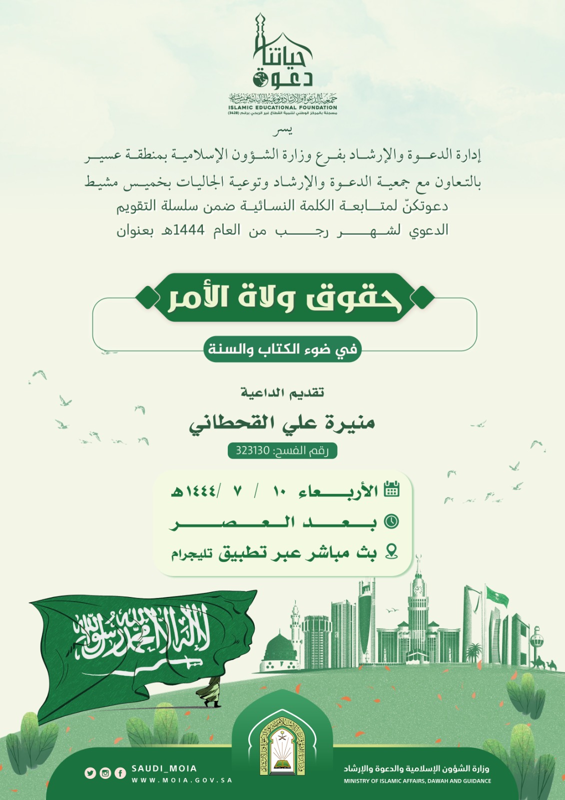 يسر إدارة الدعوة والإرشاد بفرع وزارة الشؤون الإسلامية بمنطقة عسير بالتعاون مع جمعية الدعوة والإرشاد وتوعية الجاليات بمحافظة خميس مشيط دعوتكنّ لمتابعة الكلمة النسائية بعنوان حقوق ولاة الأمر للداعية منيرة علي القحطاني يوم الأربعاء بتاريخ 10 -7 - 1444هـ بعد صلاة العصر بث مباشر عبر تطبيق تليجرام