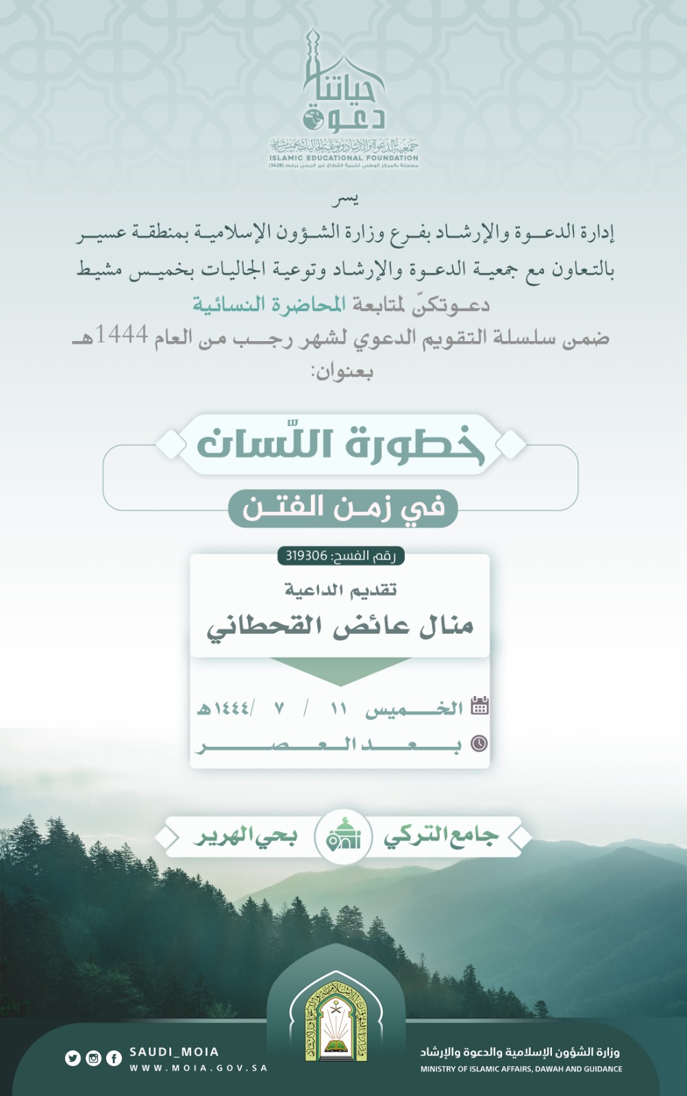 يسر إدارة الدعوة والإرشاد بفرع وزارة الشؤون الإسلامية بمنطقة عسير بالتعاون مع جمعية الدعوة والإرشاد وتوعية الجاليات بمحافظة خميس مشيط دعوتكنّ لحضور المحاضرة النسائية بعنوان خطورة اللّسان للداعية منال عائض القحطاني يوم الخميس بتاريخ 11 -7 - 1444هـ بعد صلاة العصر جامع التركي بحي الهرير