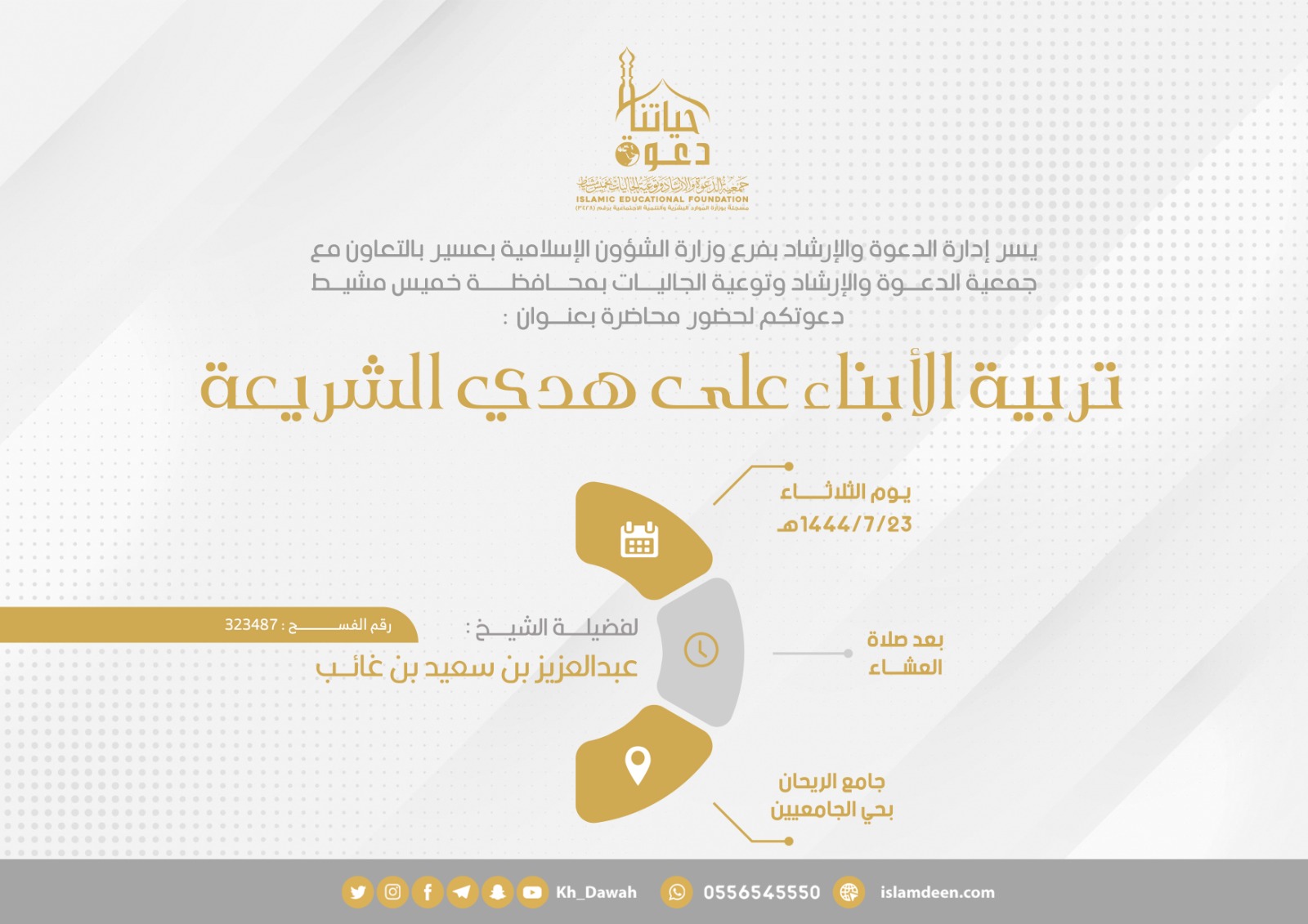 يسر إدارة الدعوة والإرشاد بفرع وزارة الشؤون الإسلامية بمنطقة عسير بالتعاون مع جمعية الدعوة والإرشاد وتوعية الجاليات بمحافظة خميس مشيط دعوتكم لحضور محاضرة بعنوان تربية الأبناء على هدي الشريعة لفضيلة الشيخ عبدالعزيز سعيد بن غائب يوم الثلاثاء 23 -7 -1444هـ بعد صلاة العشاء في جامع الريحان بحي الجامعيين