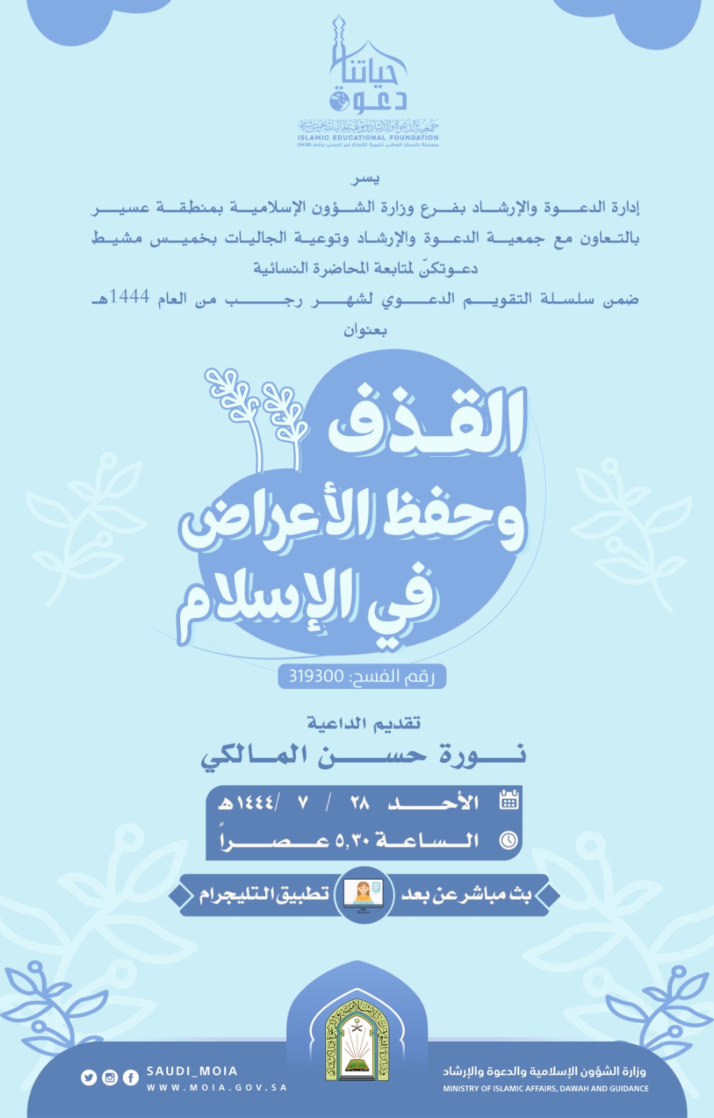 يسر إدارة الدعوة والإرشاد بفرع وزارة الشؤون الإسلامية بمنطقة عسير بالتعاون مع جمعية الدعوة والإرشاد وتوعية الجاليات بمحافظة خميس مشيط دعوتكنّ لمتابعة المحاضرة النسائية بعنوان القذف وحفظ الأعراض في الإسلام للداعية نورة حسن المالكي يوم الأحد بتاريخ 28 -7 - 1444هـ الساعة5.30 عصراً بث مباشر عبر تطبيق التليجرام