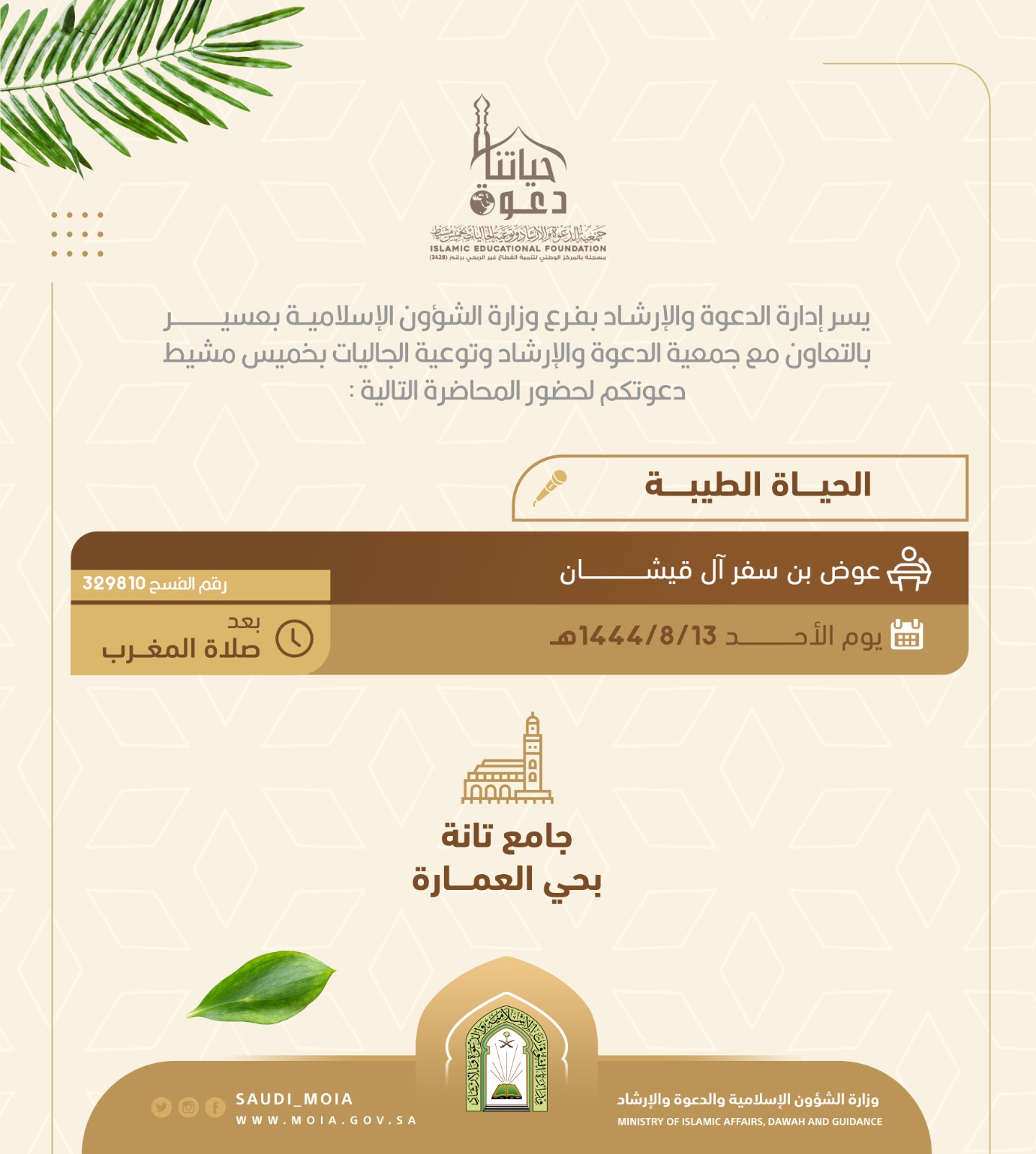 يسر إدارة الدعوة والإرشاد بفرع وزارة الشؤون الإسلامية بمنطقة عسير بالتعاون مع جمعية الدعوة والإرشاد وتوعية الجاليات بمحافظة خميس مشيط دعوتكم لحضور محاضرة بعنوان الحياة الطيبة لفضيلة الشيخ عوض بن سفر آل قيشان يوم الأحد 13-8-1444هـ بعد صلاة المغرب في جامع تانة بحي العمارة