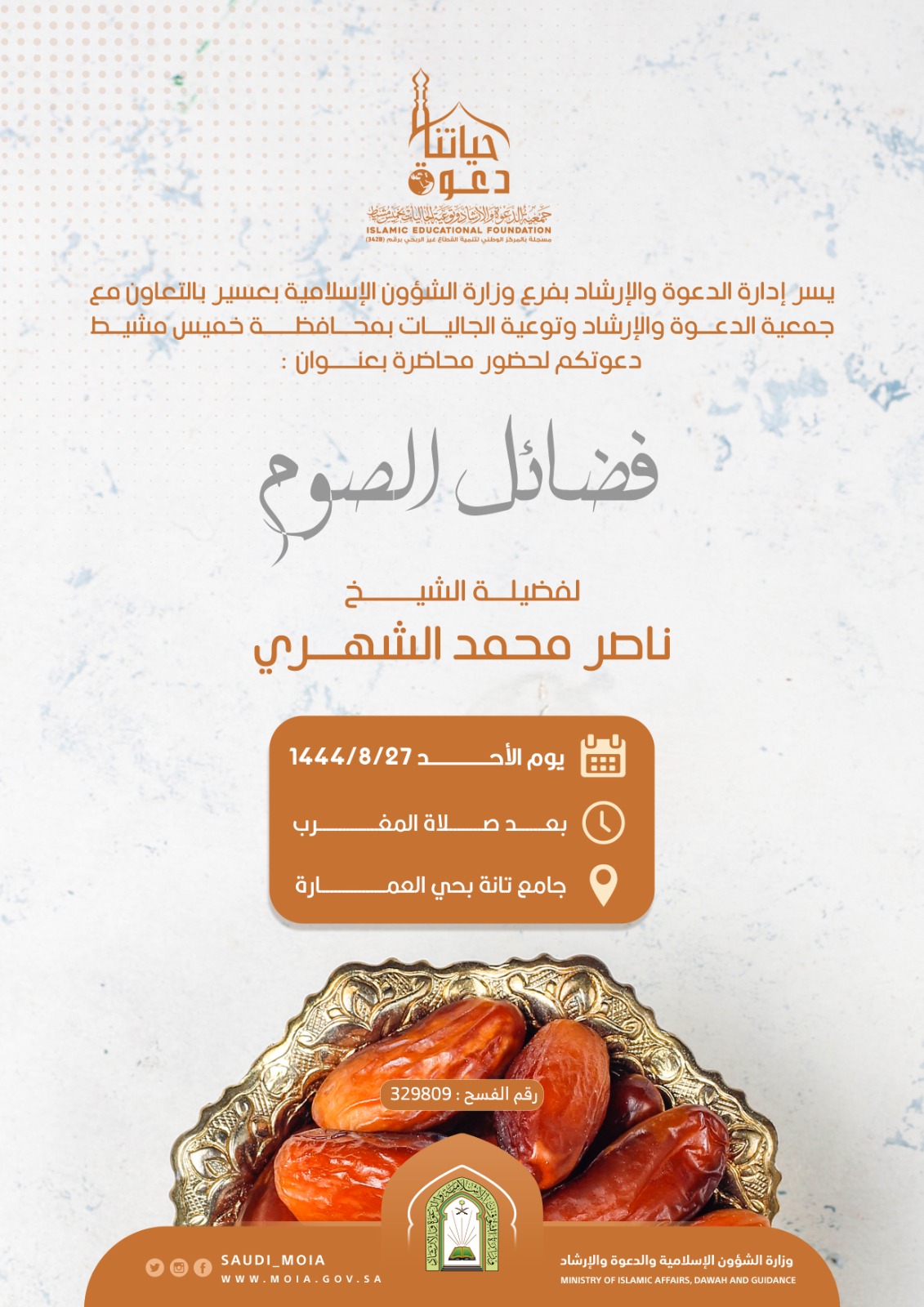 يسر إدارة الدعوة والإرشاد بفرع وزارة الشؤون الإسلامية بمنطقة عسير بالتعاون مع جمعية الدعوة والإرشاد وتوعية الجاليات بمحافظة خميس مشيط دعوتكم لحضور محاضرة بعنوان فضائل الصوم لفضيلة الشيخ ناصر محمد الشهري يوم الأحد 27-8-1444هـ بعد صلاة المغرب في جامع تانة بحي العمارة