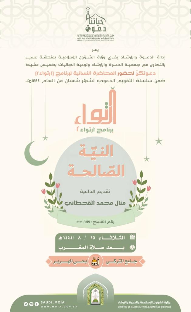 يسر إدارة الدعوة والإرشاد بفرع وزارة الشؤون الإسلامية بمنطقة عسير بالتعاون مع جمعية الدعوة والإرشاد وتوعية الجاليات بمحافظة خميس مشيط دعوتكنّ لحضور المحاضرة النسائية لبرنامج (ارتواء 2 ) بعنوان النية الصالحة تقديم الداعية منال محمد القحطاني يوم الثلاثاء بتاريخ 15 / 8 / 1444هـ بعد صلاة المغرب بجامع التركي بحي الهرير .