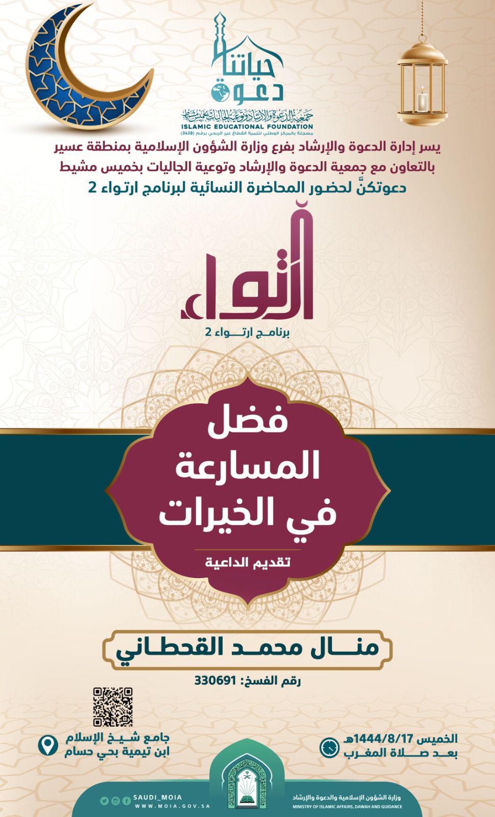يسر إدارة الدعوة والإرشاد بفرع وزارة الشؤون الإسلامية بمنطقة عسير بالتعاون مع جمعية الدعوة والإرشاد وتوعية الجاليات بمحافظة خميس مشيط دعوتكنّ لحضور المحاضرة النسائية لبرنامج (ارتواء 2 ) بعنوان فضل المسارعة في الخيرات تقديم الداعية منال محمد القحطاني يوم الخميس بتاريخ 17 / 8 / 1444هـ بعد صلاة المغرب بجامع شيخ الإسلام ابن تيمية بحي حسام .