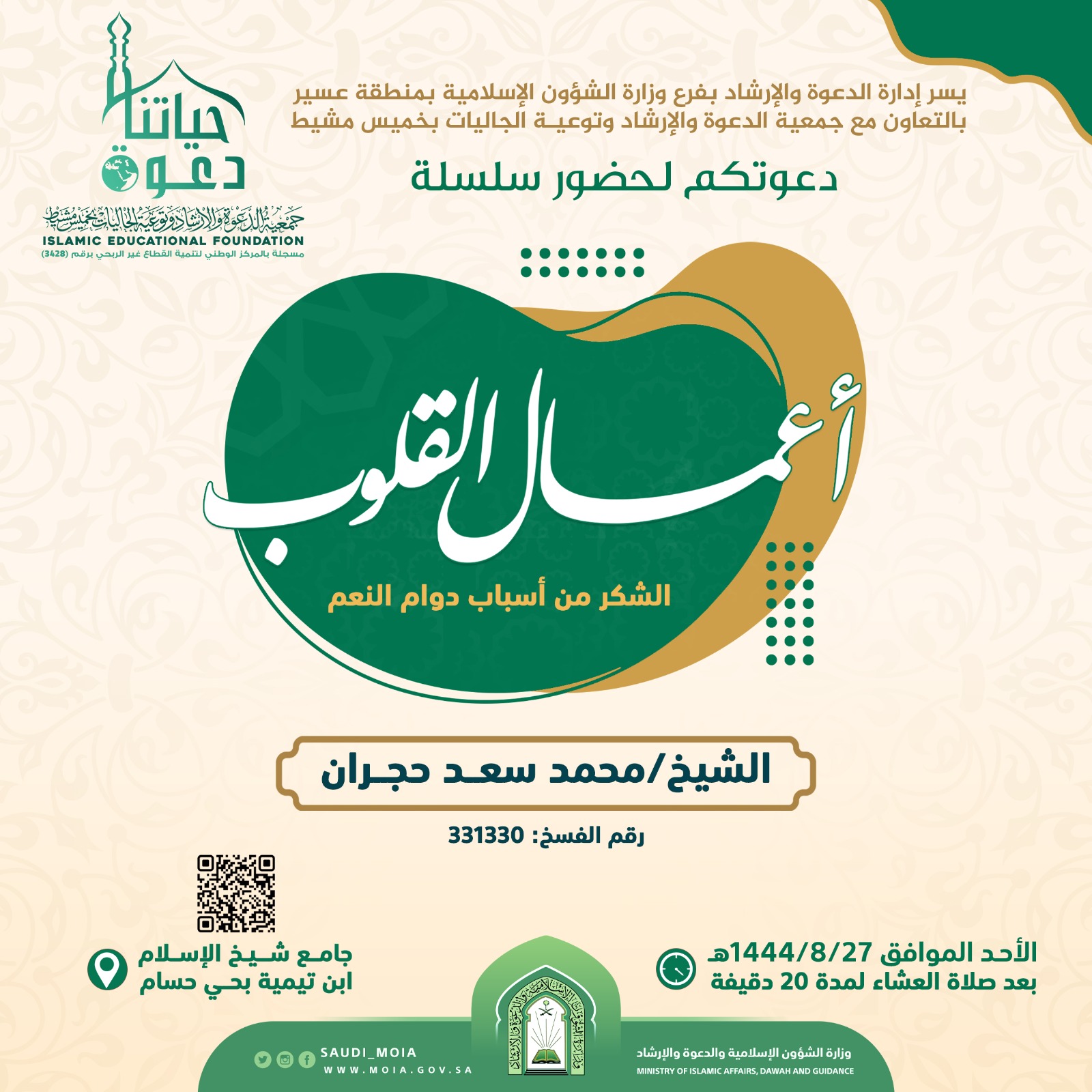 يسر إدارة الدعوة والإرشاد بفرع وزارة الشؤون الإسلامية بمنطقة عسير بالتعاون مع جمعية الدعوة والإرشاد وتوعية الجاليات بمحافظة خميس مشيط دعوتكم لحضور سلسلة بعنوان أعمال القلوب لفضيلة الشيخ محمد سعد حجران يوم الاأحد 27-8-1444هـ بعد صلاة العشاء لمدة 20 دقيقة في جامع شيخ الإسلام ابن تيمية بحي حسام