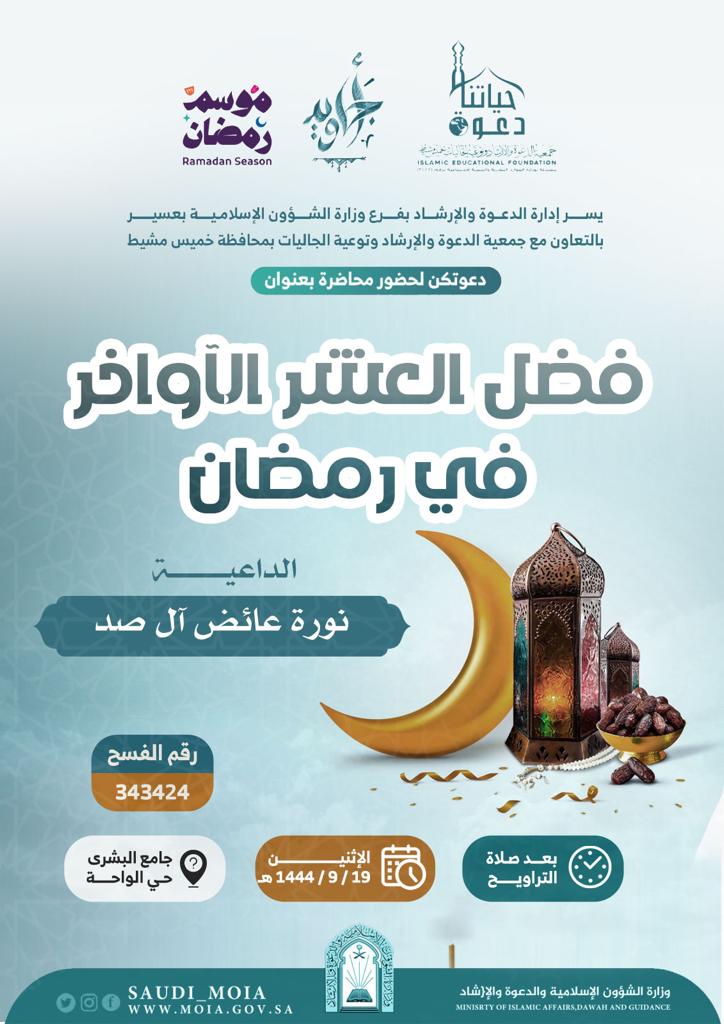 يسر إدارة الدعوة والإرشاد بفرع وزارة الشؤون الإسلامية بمنطقة عسير بالتعاون مع جمعية الدعوة والإرشاد وتوعية الجاليات بمحافظة خميس مشيط دعوتكنّ لحضور محاضرة بعنوان: فضل العشر الآواخر في رمضان تقديم الداعية: نورة عايض آل صد يوم الاثنين 19 / 9 / 1444هـ بعد صلاة التراويح بجامع عبدالرحمن البشري بحي الواحة خلف محطة الواحة.