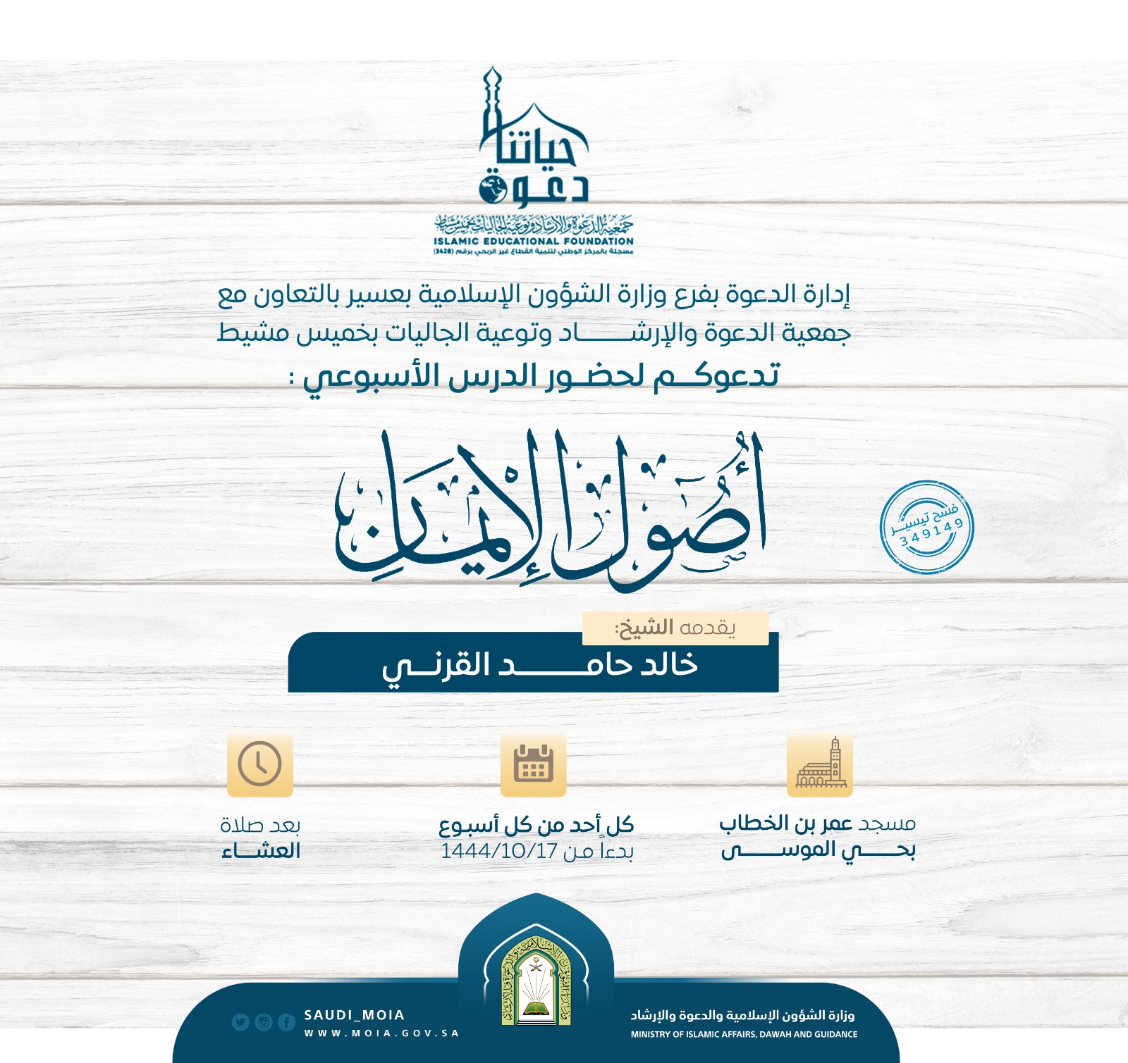 يسر إدارة الدعوة بفرع وزارة الشؤون الإسلامية بعسير بالتعاون مع جمعية الدعوة بخميس مشيط تدعوكم لحضور الدرس الأسبوعي بعنوان أصول الإيمان يقدمها الشيخ: خالد حامد القرني بمسجد عمر بن الخطاب رضي الله عنه بحي الموسى كل احد من كل أسبوع بدءاً من 17/ 10 / 1444هـ بعد صلاة العشاء.