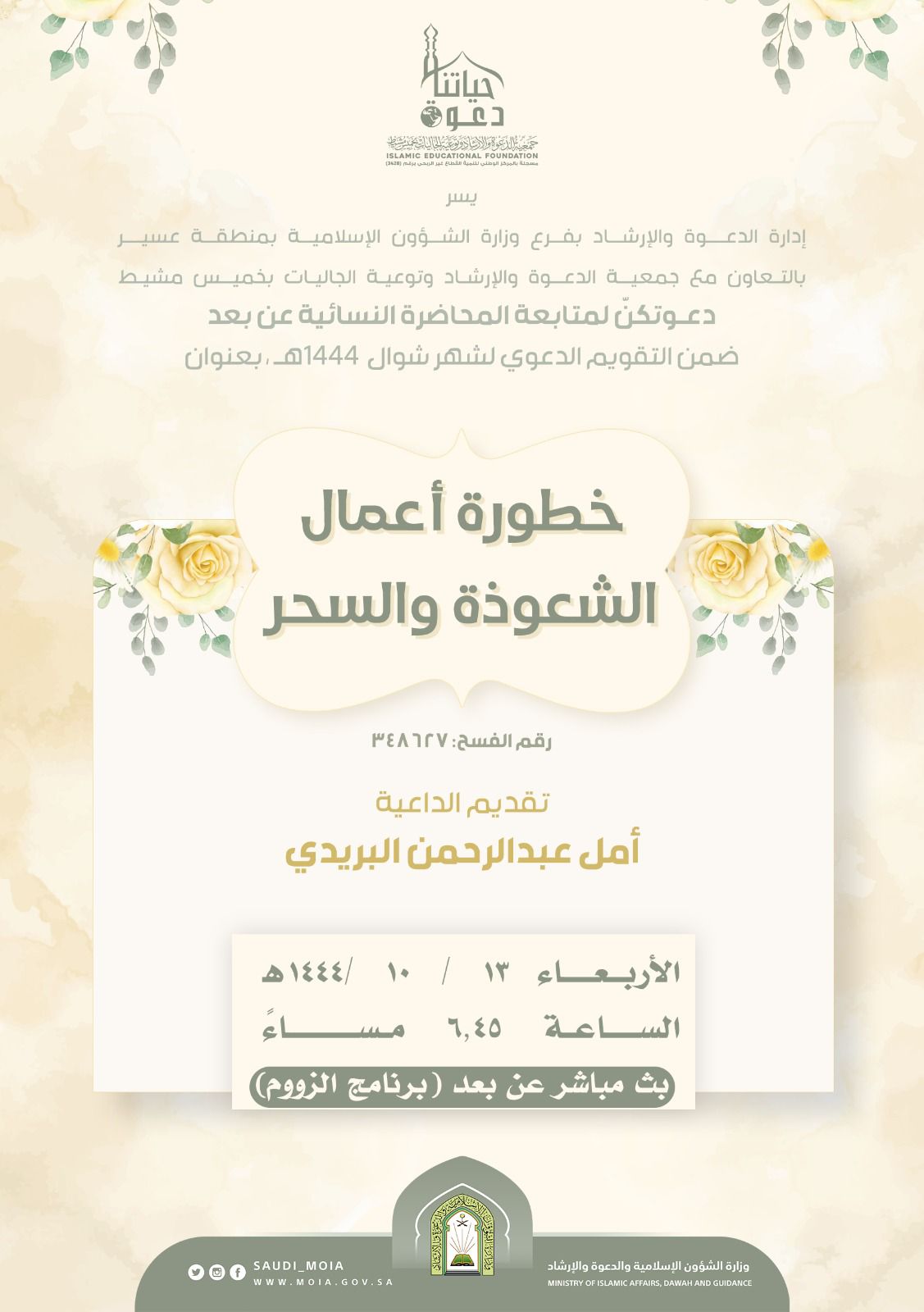 يسر إدارة الدعوة والإرشاد بفرع وزارة الشؤون الإسلامية بمنطقة عسير بالتعاون مع جمعية الدعوة والإرشاد وتوعية الجاليات بمحافظة خميس مشيط دعوتكنّ لمتابعة المحاضرة النسائية عن بعد بعنوان: خطورة أعمال الشعوذة والسحر تقديم الداعية: أمل عبدالرحمن البريدي يوم الأربعاء 13 / 10 / 1444هـ الساعة 6,45 مساءً بث مباشر عن بعد (برنامج الزوم)