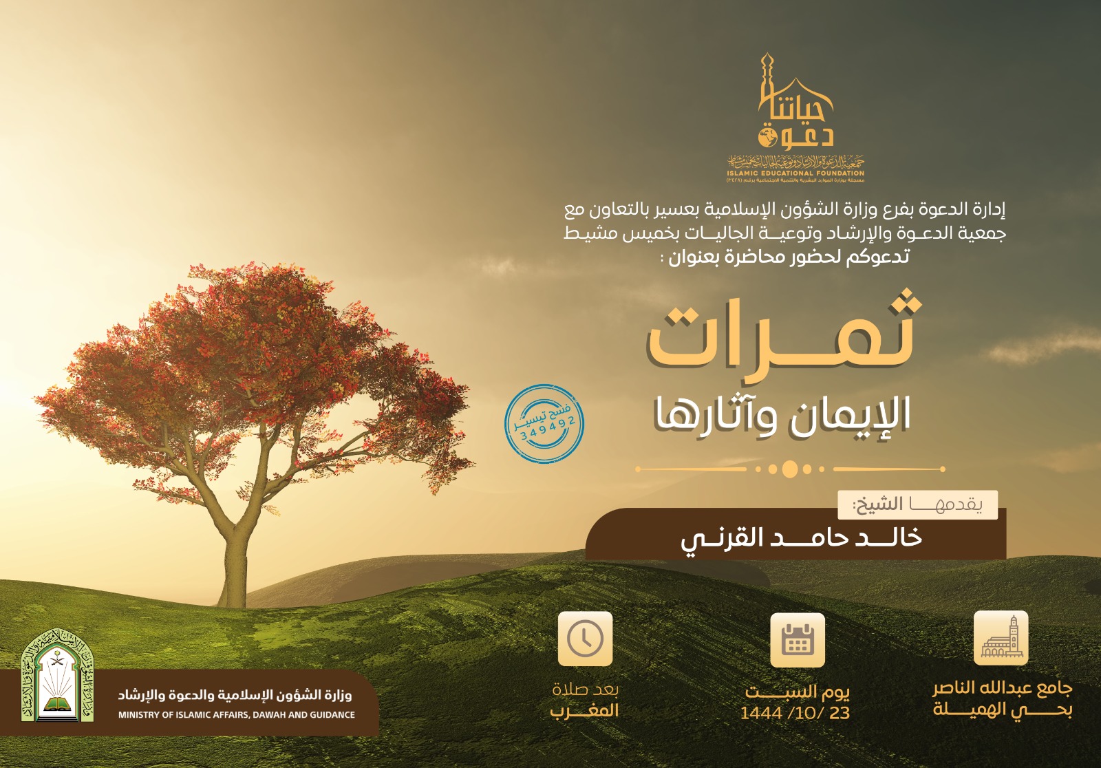يسر إدارة الدعوة بفرع وزارة الشؤون الإسلامية بعسير بالتعاون مع جمعية الدعوة بخميس مشيط تدعوكم لحضور محاضرة بعنوان: ثمرات الإيمان وآثارها يقدمها الشيخ: خالد حامد القرني بجامع عبدالله الناصر بحي الهميلة يوم السبت 23 / 10 / 1444هـ بعد صلاة المغرب.