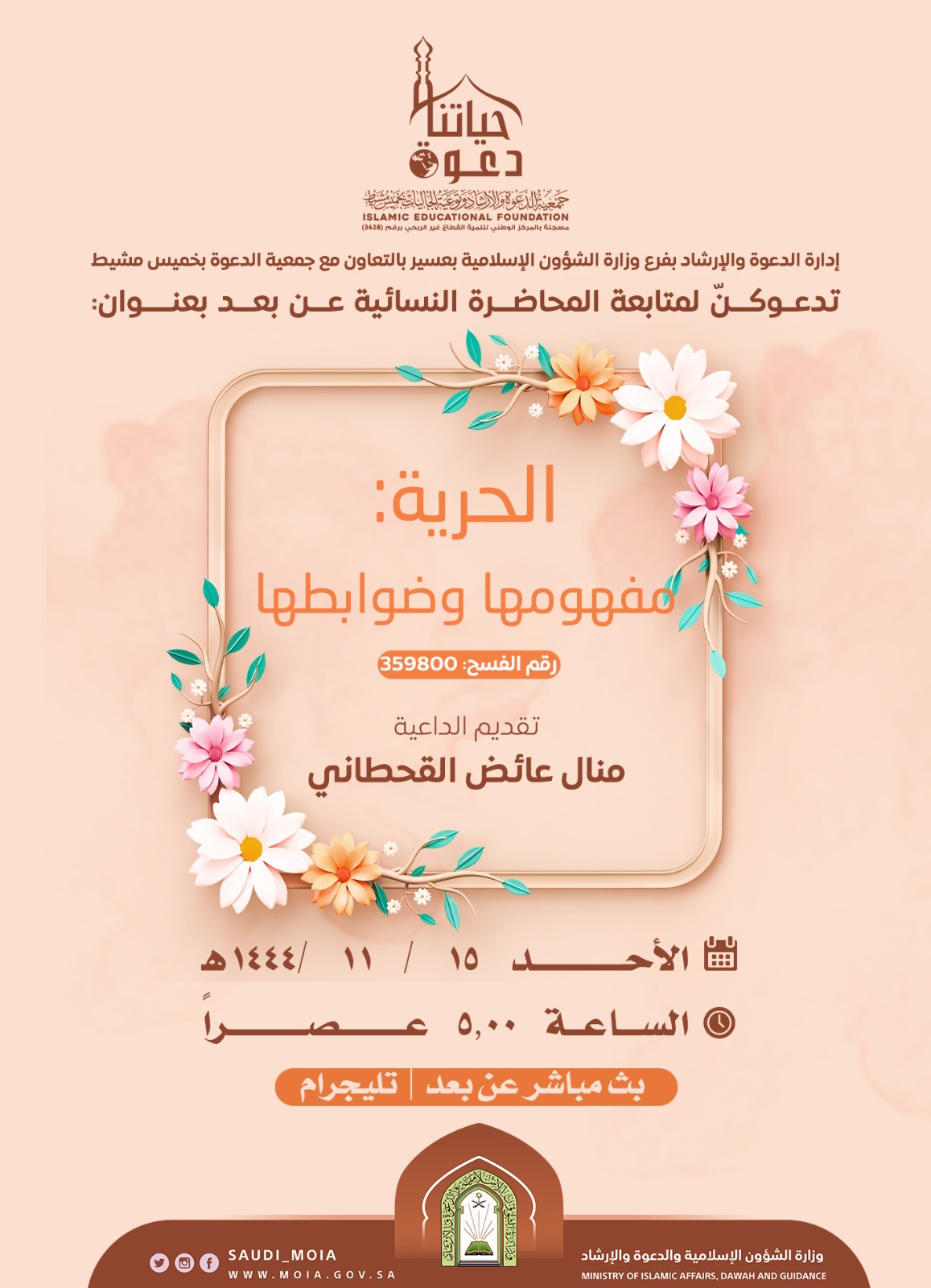 يسر إدارة الدعوة والإرشاد بفرع وزارة الشؤون الإسلامية بمنطقة عسير بالتعاون مع جمعية الدعوة والإرشاد وتوعية الجاليات بمحافظة خميس مشيط دعوتكنّ لمتابعة المحاضرة النسائية عن بعد بعنوان: الحرية مفهومها وضوابطها تقديم الداعية: منال عائض القحطاني يوم الأحد 15 / 11 / 1444هـ الساعة 5,00 عصراً بث مباشر عن بعد (برنامج التليجرام).