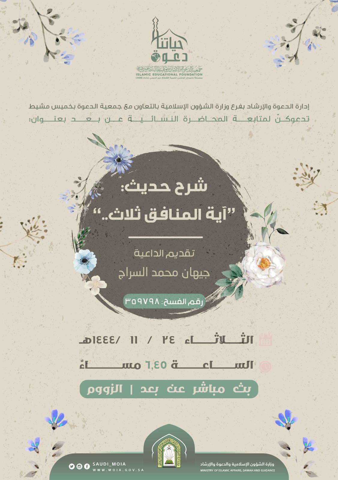 يسر إدارة الدعوة والإرشاد بفرع وزارة الشؤون الإسلامية بمنطقة عسير بالتعاون مع جمعية الدعوة والإرشاد وتوعية الجاليات بمحافظة خميس مشيط دعوتكنّ لمتابعة المحاضرة النسائية عن بعد بعنوان: شرح حديث " آية المنافق ثلاث" تقديم الداعية: جيهان محمد السراج يوم الثلاثاء 24 / 11 / 1444هـ الساعة 6,45 مساءً بث مباشر عن بعد (برنامج الزوم).
