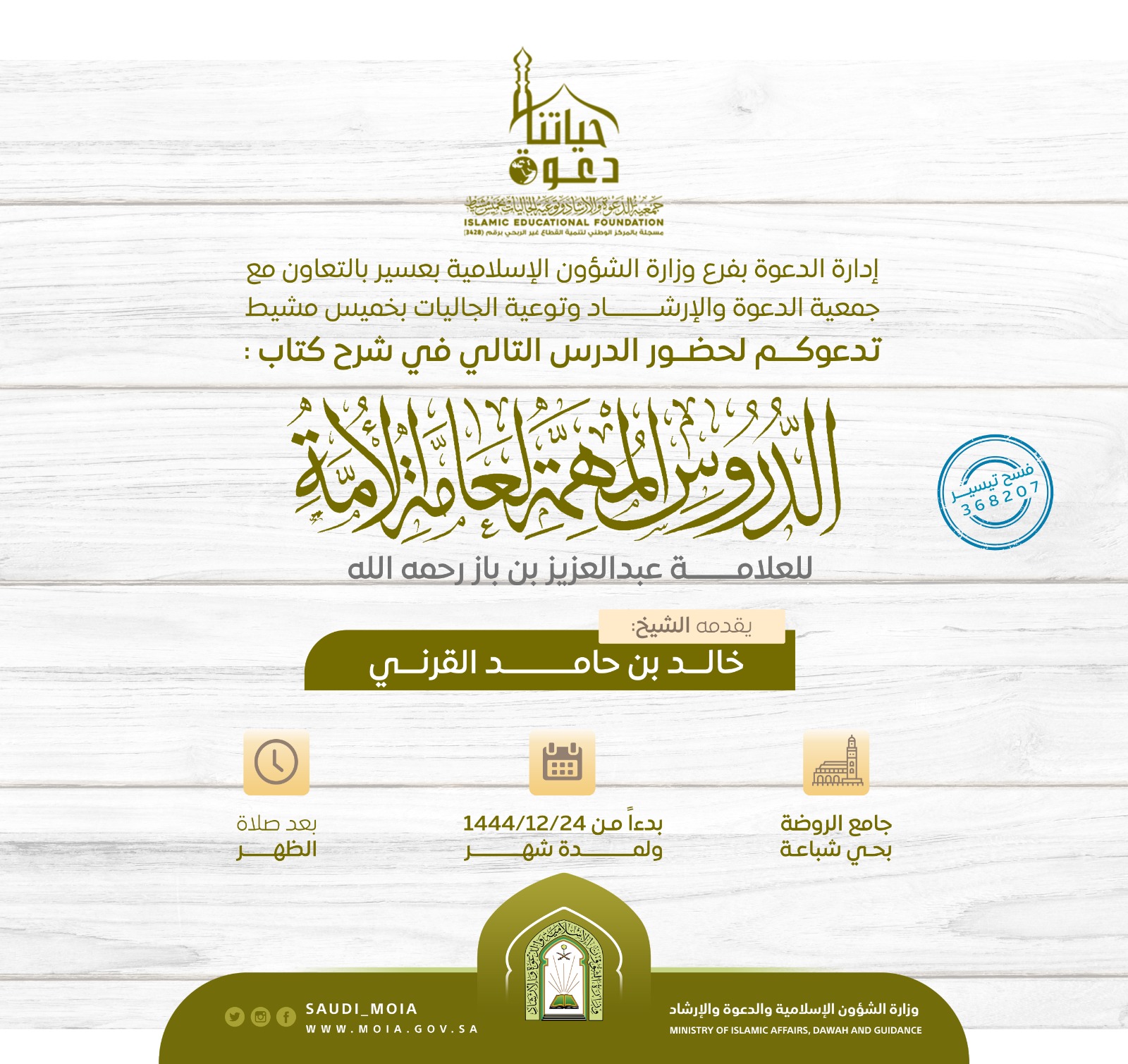 يسر إدارة الدعوة بفرع وزارة الشؤون الإسلامية بعسير بالتعاون مع جمعية الدعوة بخميس مشيط تدعوكم لحضور الدرس التالي في شرح كتاب الدروس المهمة لعامة الأمة للعلامة عبدالعزيز ابن باز رحمه الله يقدمها الشيخ: خالد حامد القرني بجامع الروضة بحي شباعة بدءاً من 24 / 12/ 1444هـ ولمدة شهر بعد صلاة الظهر.