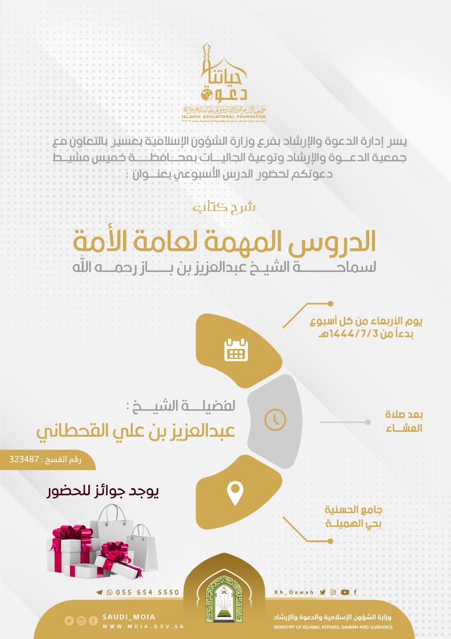 يسر إدارة الدعوة بفرع وزارة الشؤون الإسلامية بعسير بالتعاون مع جمعية الدعوة وتوعية الجاليات بخميس مشيط دعوتكم لحضور الدرس الأسبوعي بعنوان شرح كتاب الدروس المهمة لعامة الأمة لسماحة الشيخ عبدالعزيز بن باز رحمه الله يقدمها الشيخ: عبدالعزيز بن علي القحطاني بجامع الحسنية بالهميلة يوم الأربعاء من كل أسبوع بدءاً من 3/ 7/ 1444هـ بعد صلاة العشاء.