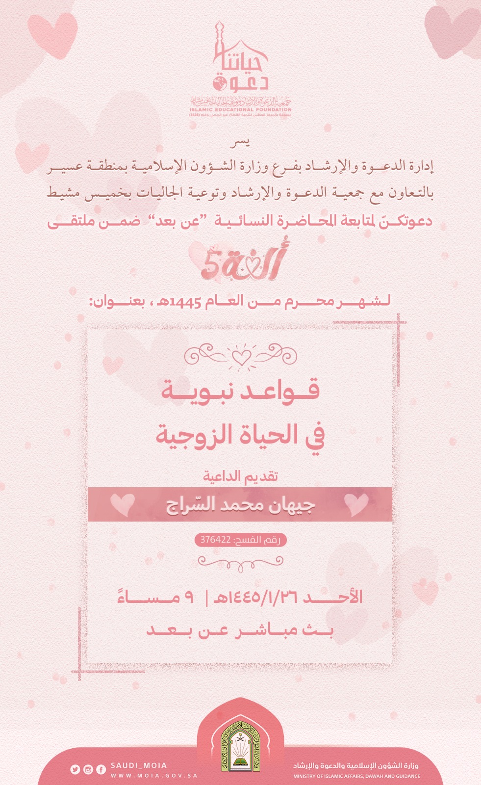 يسر إدارة الدعوة والإرشاد بفرع وزارة الشؤون الإسلامية بمنطقة عسير بالتعاون مع جمعية الدعوة والإرشاد وتوعية الجاليات بمحافظة خميس مشيط دعوتكنّ لمتابعة المحاضرة النسائية عن بعد بعنوان قواعد نبوية في الحياة الزوجية تقديم الداعية: جيهان محمد السراج يوم الأحد 26/ 1/ 1445هـ الساعة 9 مساءً بث مباشر عن بعد.