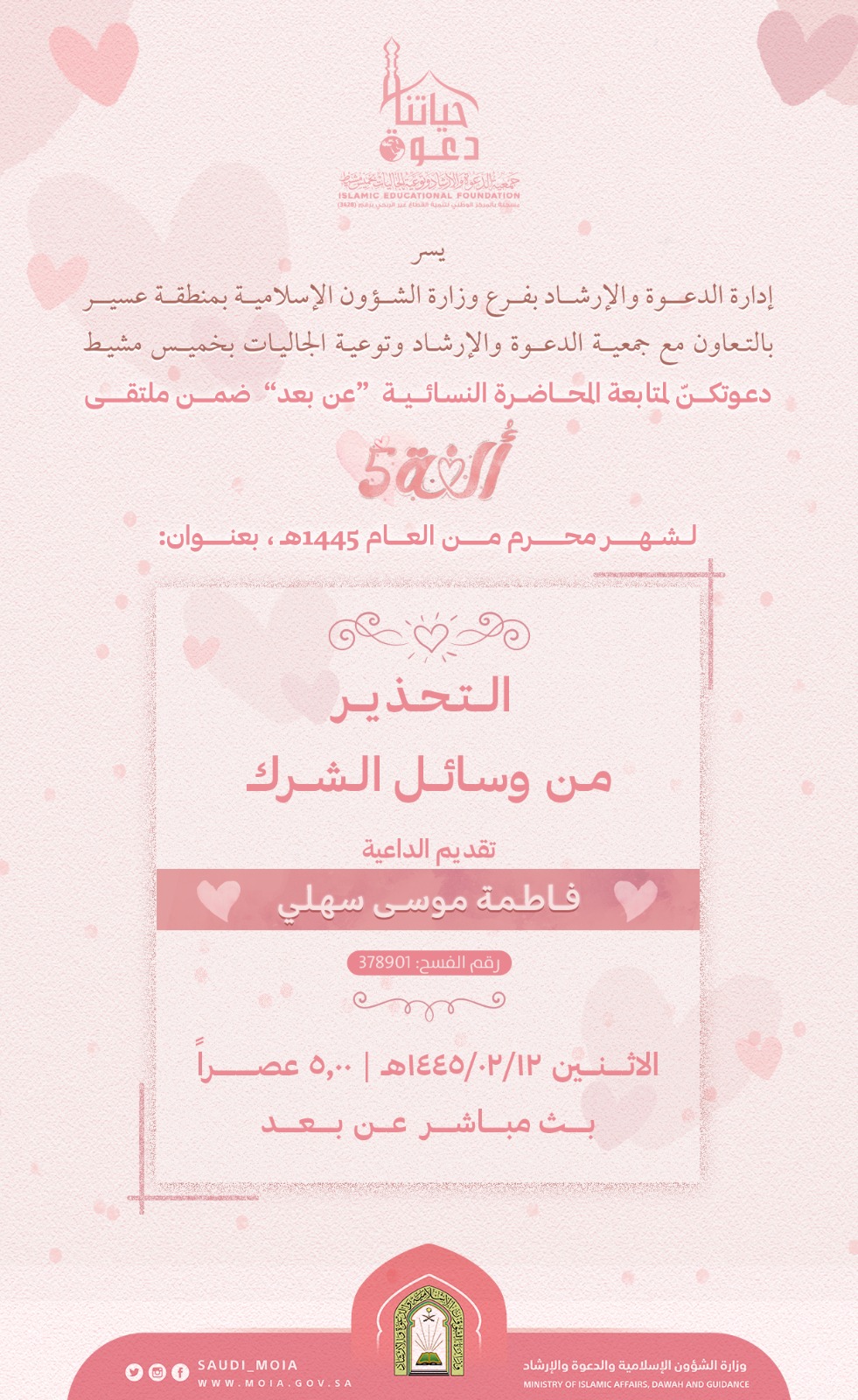 يسر إدارة الدعوة والإرشاد بفرع وزارة الشؤون الإسلامية بمنطقة عسير بالتعاون مع جمعية الدعوة والإرشاد وتوعية الجاليات بمحافظة خميس مشيط دعوتكنّ لمتابعة المحاضرة النسائية بعنوان التحريم من وسائل الشرك تقديم الداعية: فاطمة موسى سهلي يوم الاثنين 13/ 2/ 1445هـ الساعة الخامسة عصرا بث مباشر عن بعد.
