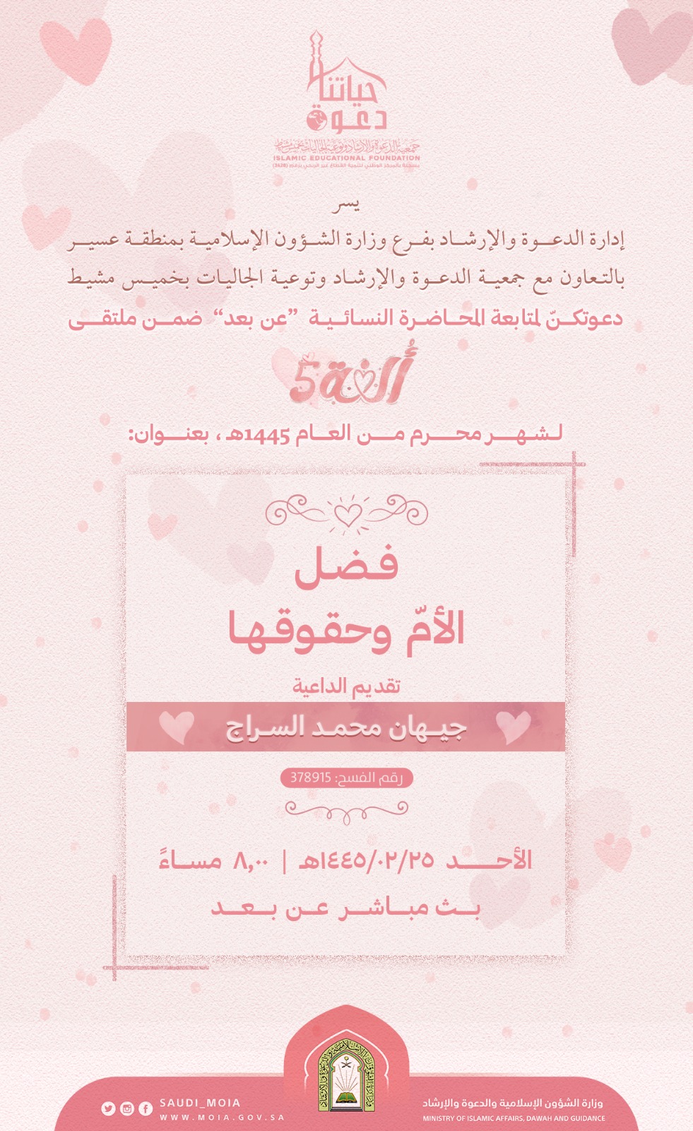 يسر إدارة الدعوة والإرشاد بفرع وزارة الشؤون الإسلامية بمنطقة عسير بالتعاون مع جمعية الدعوة والإرشاد وتوعية الجاليات بمحافظة خميس مشيط دعوتكنّ لمتابعة المحاضرة النسائية بعنوان فضل الأم وحقوقها تقديم الداعية: جيهان محمد السراج يوم الأحد 25/ 2/ 1445هـ الساعة 8 مساءً بث مباشر عن بعد.