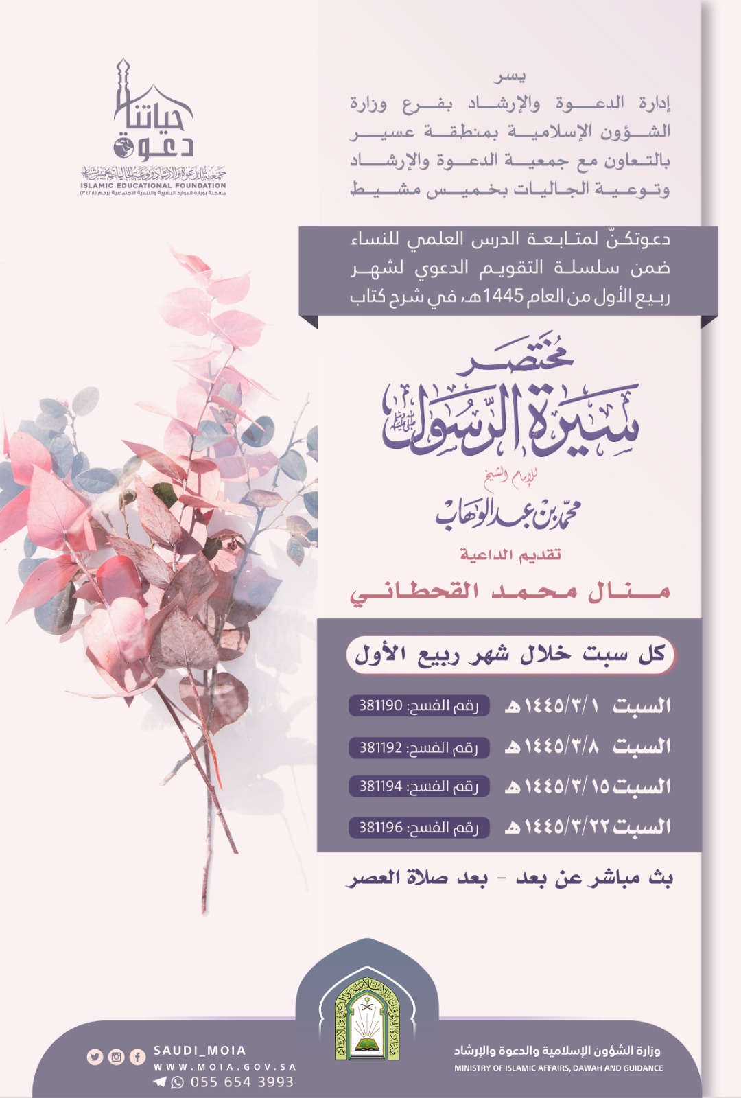 يسر إدارة الدعوة والإرشاد بفرع وزارة الشؤون الإسلامية بمنطقة عسير بالتعاون مع جمعية الدعوة والإرشاد وتوعية الجاليات بمحافظة خميس مشيط دعوتكنّ لمتابعة الدرس العلمي للنساء في شرح كتاب مختصر سيرة الرسول صلى الله علية وسلم تقديم الداعية: منال محمد القحطاني كل سبت خلال شهر ربيع الأول بعد صلاة العصر بث مباشر عن بعد.