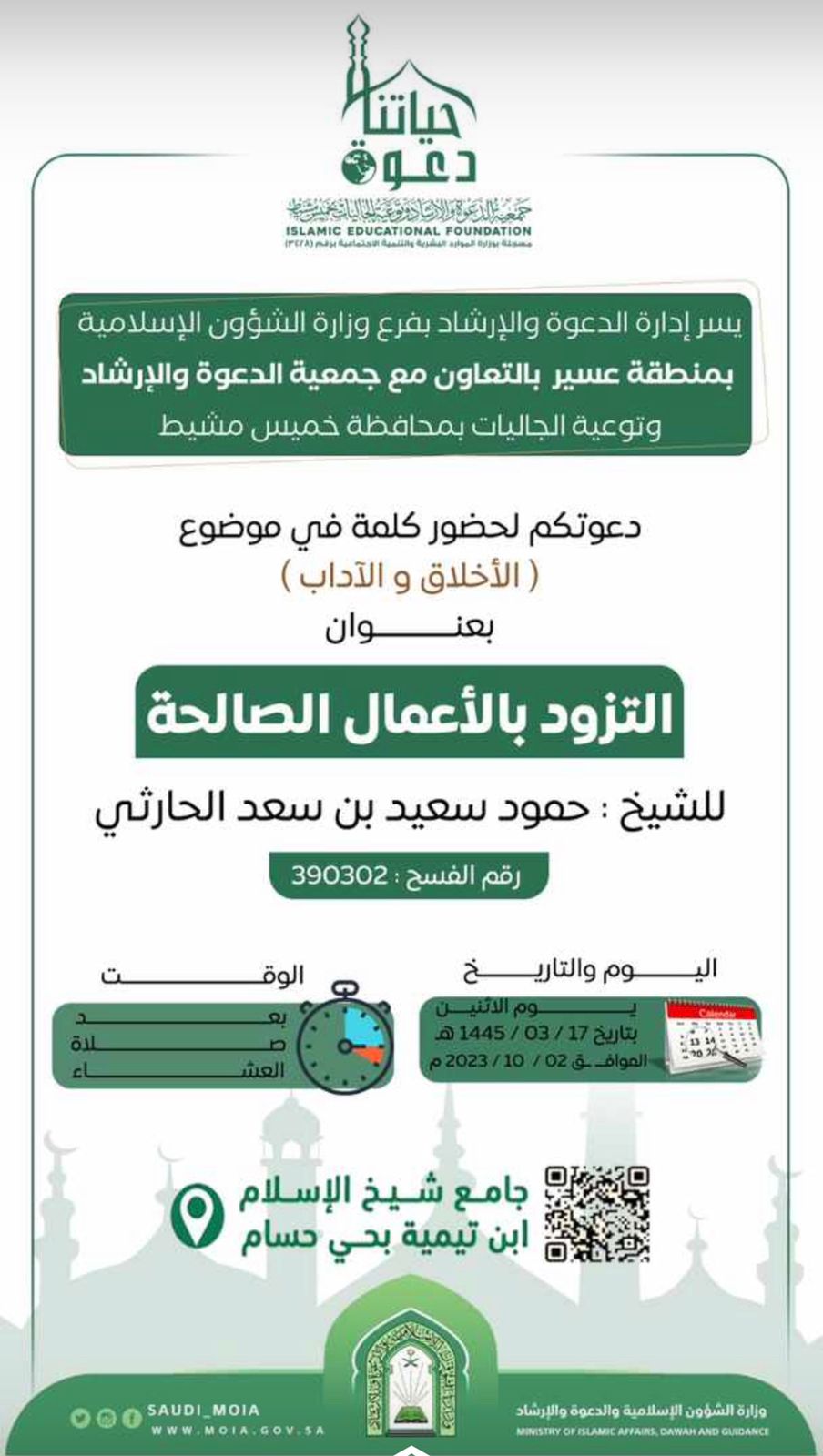يسر إدارة الدعوة بفرع وزارة الشؤون الإسلامية بعسير بالتعاون مع جمعية الدعوة وتوعية الجاليات بخميس مشيط تدعوكم لحضور كلمة في (الأخلاق والآداب) بعنوان التزود بالأعمال الصالحة يقدمها الشيخ: حمود سعيد بن سعد الحارثي بجامع شيخ الإسلام ابن تيمية بحي حسام يوم الاثنين 17/ 3/ 1445هـ بعد صلاة العشاء.