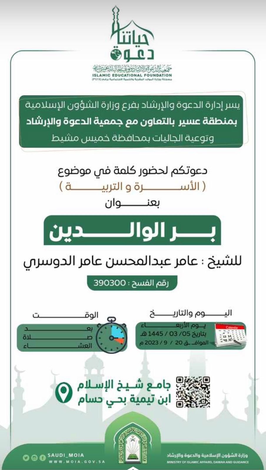 يسر إدارة الدعوة بفرع وزارة الشؤون الإسلامية بعسير بالتعاون مع جمعية الدعوة وتوعية الجاليات بخميس مشيط تدعوكم لحضور كلمة في موضوع (الأسرة والتربية) بعنوان بر الوالدين يقدمها الشيخ: عامر عبدالمحسن عامر الدوسري بجامع شيخ الإسلام ابن تيمية بحي حسام يوم الأربعاء 5/ 3/ 1445هـ بعد صلاة العشاء.