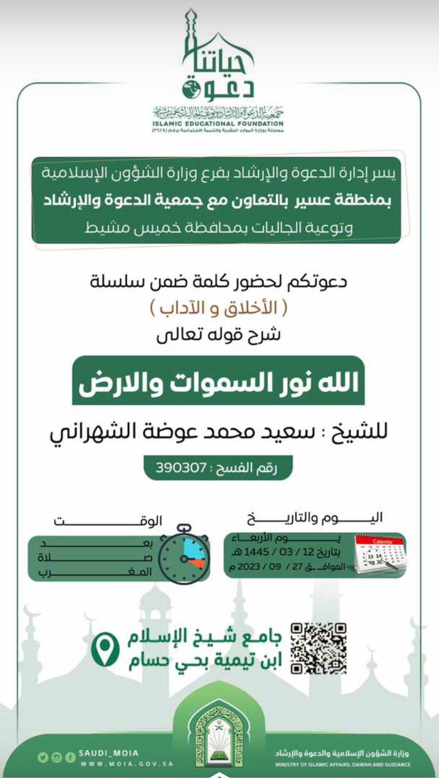 يسر إدارة الدعوة بفرع وزارة الشؤون الإسلامية بعسير بالتعاون مع جمعية الدعوة وتوعية الجاليات بخميس مشيط تدعوكم لحضور كلمة في (الأخلاق والآداب) بعنوان شرح قوله تعالى: "الله نور السموات والأرض" يقدمها الشيخ: سعيد محمد عوضة الشهراني بجامع شيخ الإسلام ابن تيمية بحي حسام يوم الأربعاء 12/ 3/ 1445هـ بعد صلاة المغرب.