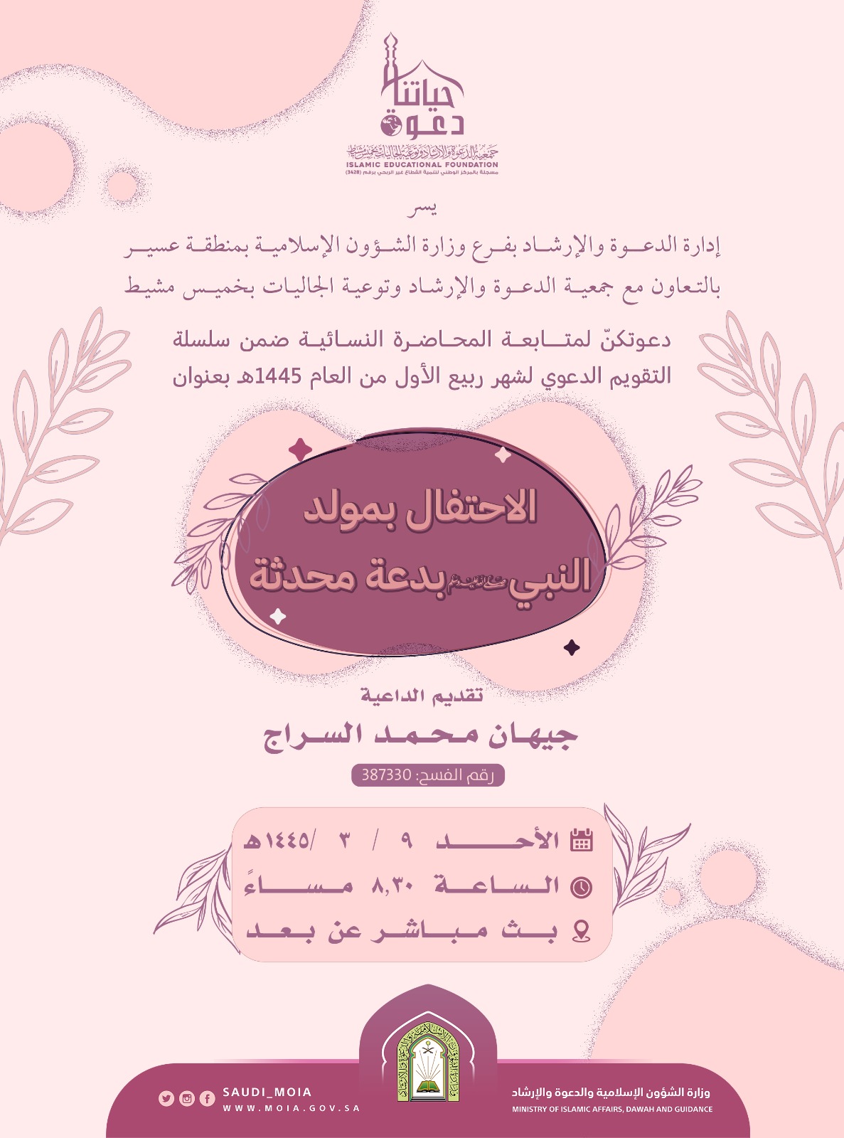 يسر إدارة الدعوة والإرشاد بفرع وزارة الشؤون الإسلامية بمنطقة عسير بالتعاون مع جمعية الدعوة والإرشاد وتوعية الجاليات بمحافظة خميس مشيط دعوتكنّ لمتابعة المحاضرة النسائية بعنوان الاحتفال بمولد النبي صلى الله عليه وسلم بدعة محدثة تقديم الداعية: جيهان محمد السراج يوم الأحد 9/ 3/ 1445هـ الساعة 8.30 مساءً بث مباشر عن بعد.