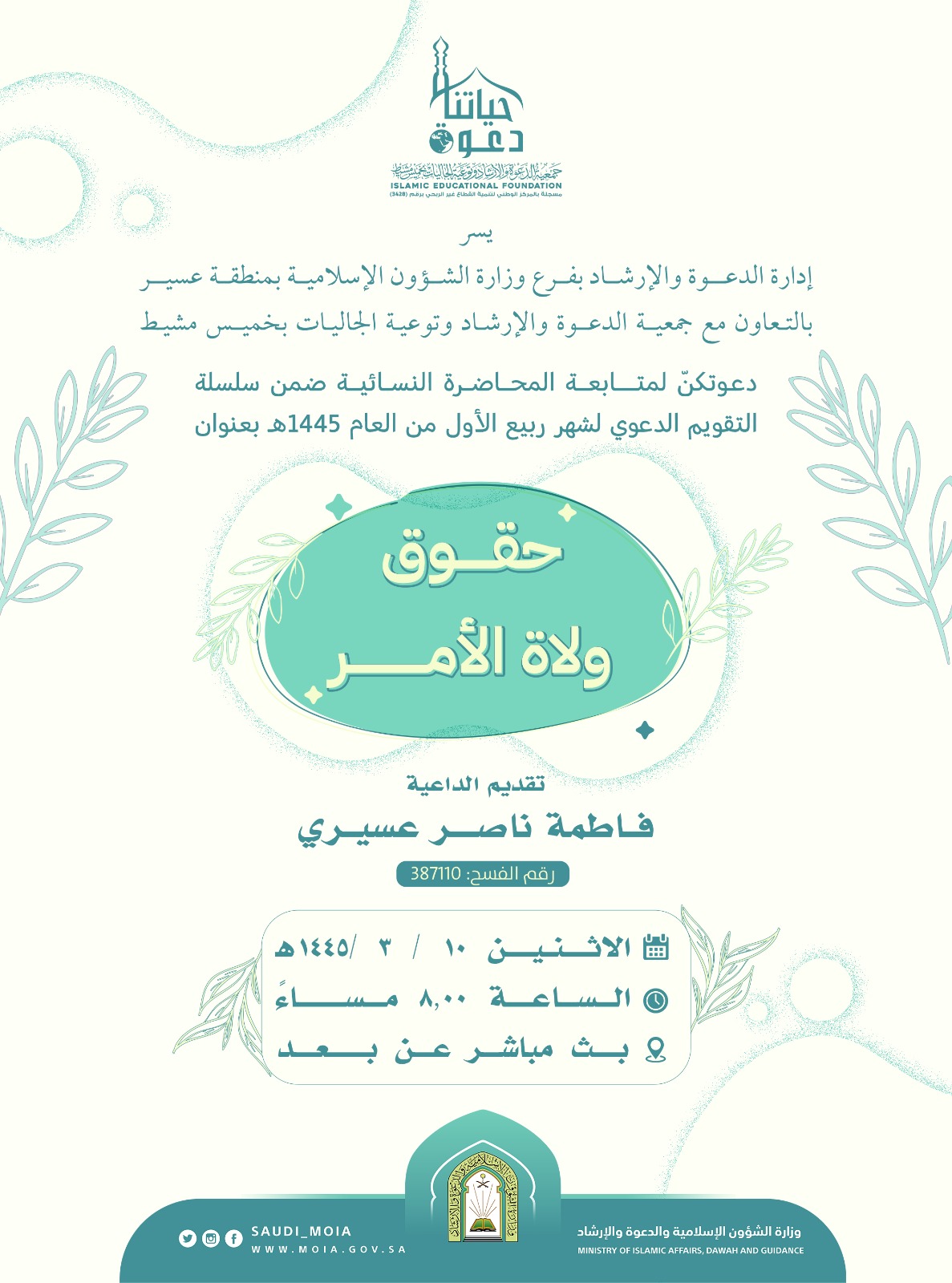 يسر إدارة الدعوة والإرشاد بفرع وزارة الشؤون الإسلامية بمنطقة عسير بالتعاون مع جمعية الدعوة والإرشاد وتوعية الجاليات بمحافظة خميس مشيط دعوتكنّ لمتابعة المحاضرة النسائية بعنوان حقوق ولاة الأمر تقديم الداعية: فاطمة ناصر عسيري يوم الاثنين 10/ 3/ 1445هـ الساعة الثامنة مساءً بث مباشر عن بعد.