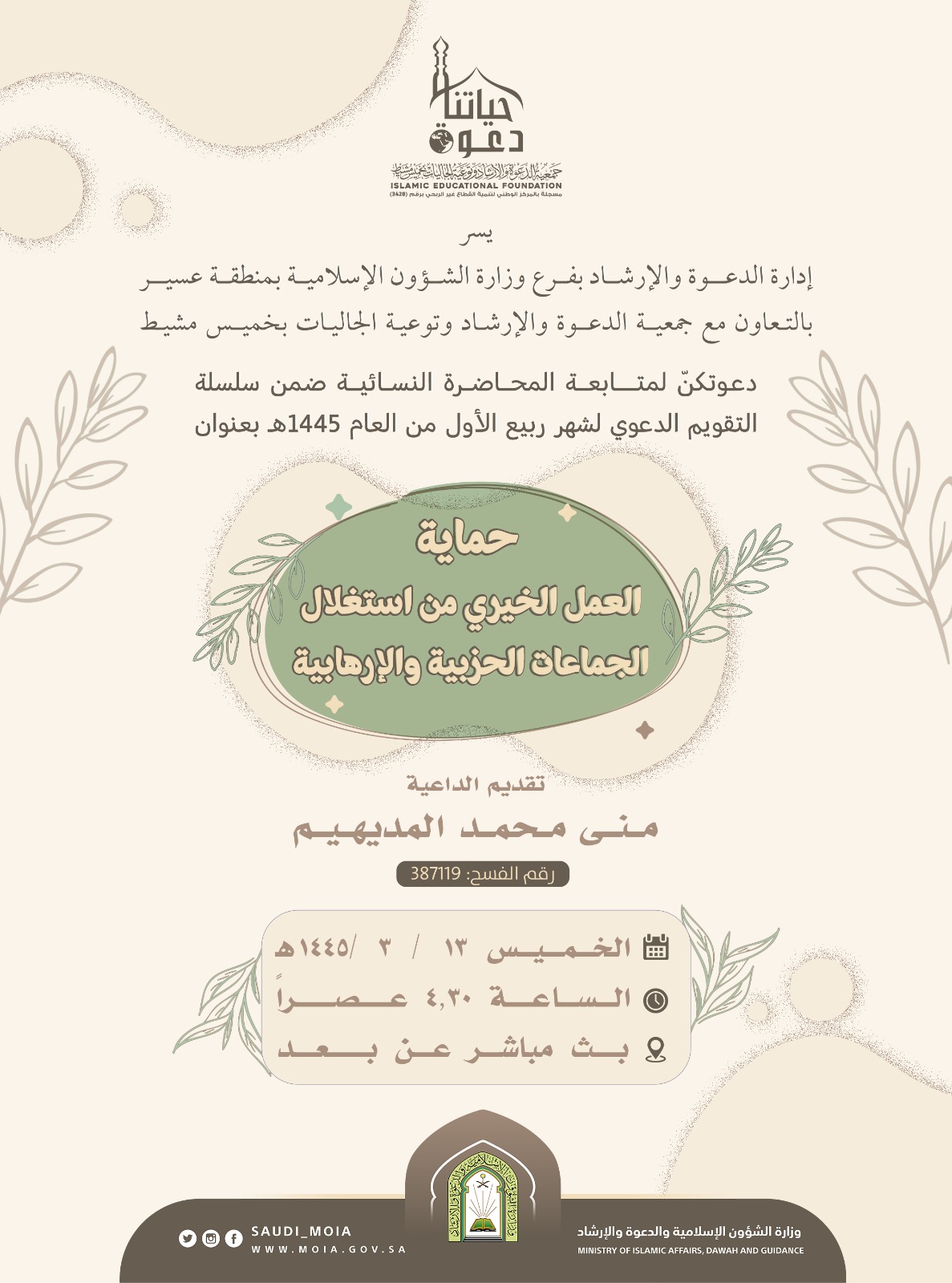 يسر إدارة الدعوة والإرشاد بفرع وزارة الشؤون الإسلامية بمنطقة عسير بالتعاون مع جمعية الدعوة والإرشاد وتوعية الجاليات بمحافظة خميس مشيط دعوتكنّ لمتابعة المحاضرة النسائية بعنوان حماية العمل الخيري من استغلال الجماعات الحزبية والإرهابية تقديم الداعية: منى محمد المديهيم يوم الخميس 13/ 3/ 1445هـ الساعة 4.30 عصراً بث مباشر عن بعد.