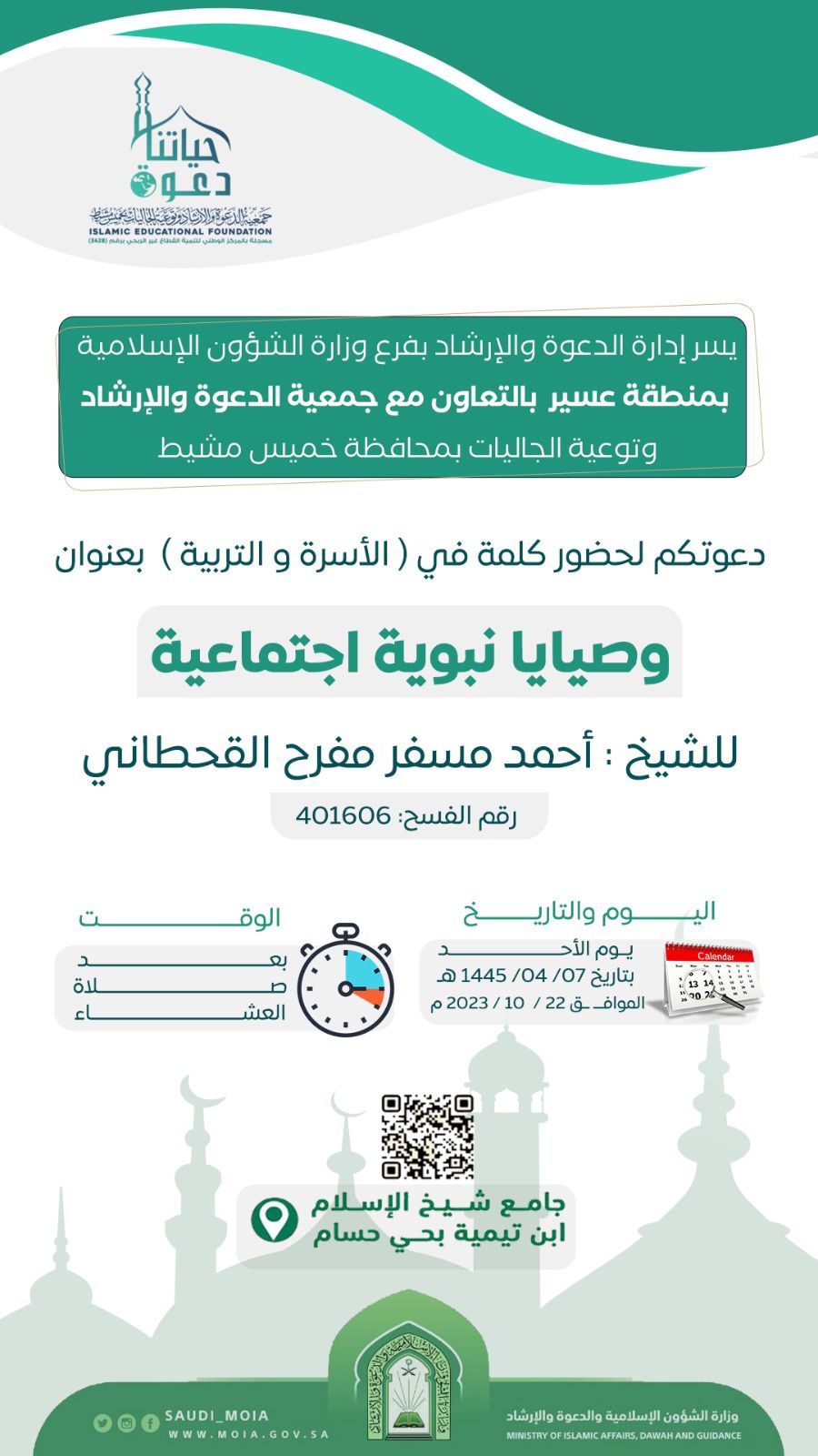 يسر إدارة الدعوة بفرع وزارة الشؤون الإسلامية بعسير بالتعاون مع جمعية الدعوة وتوعية الجاليات بخميس مشيط تدعوكم لحضور محاضرة بعنوان: وصايا نبوية اجتماعية يقدمها الشيخ: أحمد مسفر مفرح القحطاني بجامع شيخ الإسلام ابن تيمية بحي حسام يوم الأحد 7/ 4/ 1445هـ بعد صلاة العشاء.