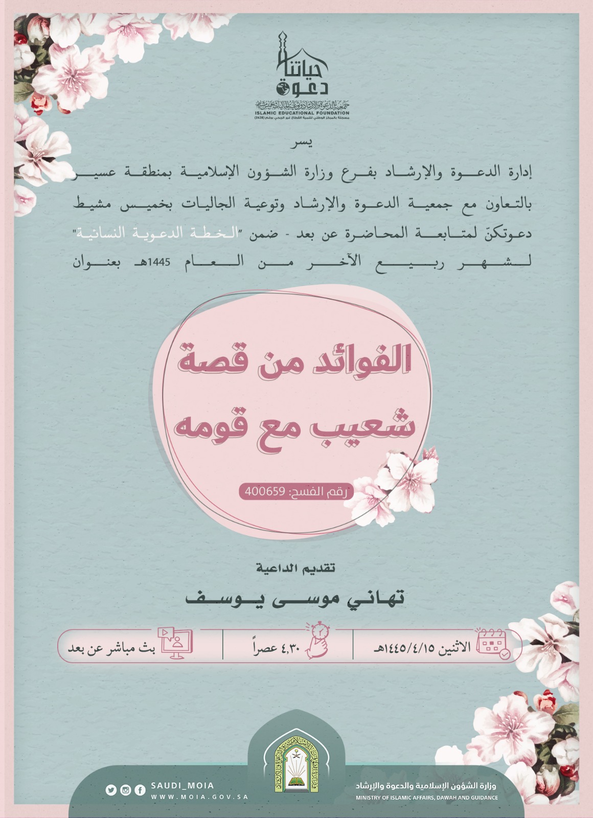 يسر إدارة الدعوة بفرع وزارة الشؤون الإسلامية بعسير بالتعاون مع جمعية الدعوة وتوعية الجاليات بخميس مشيط دعوتكنّ لمتابعة المحاضرة النسائية عن بعد بعنوان: الفوائد من قصة شعيب مع قومه تقدمها الداعية: تهاني موسى يوسف يوم الاثنين 15/ 4/ 1445هـ الساعة 4:30 عصراً.
