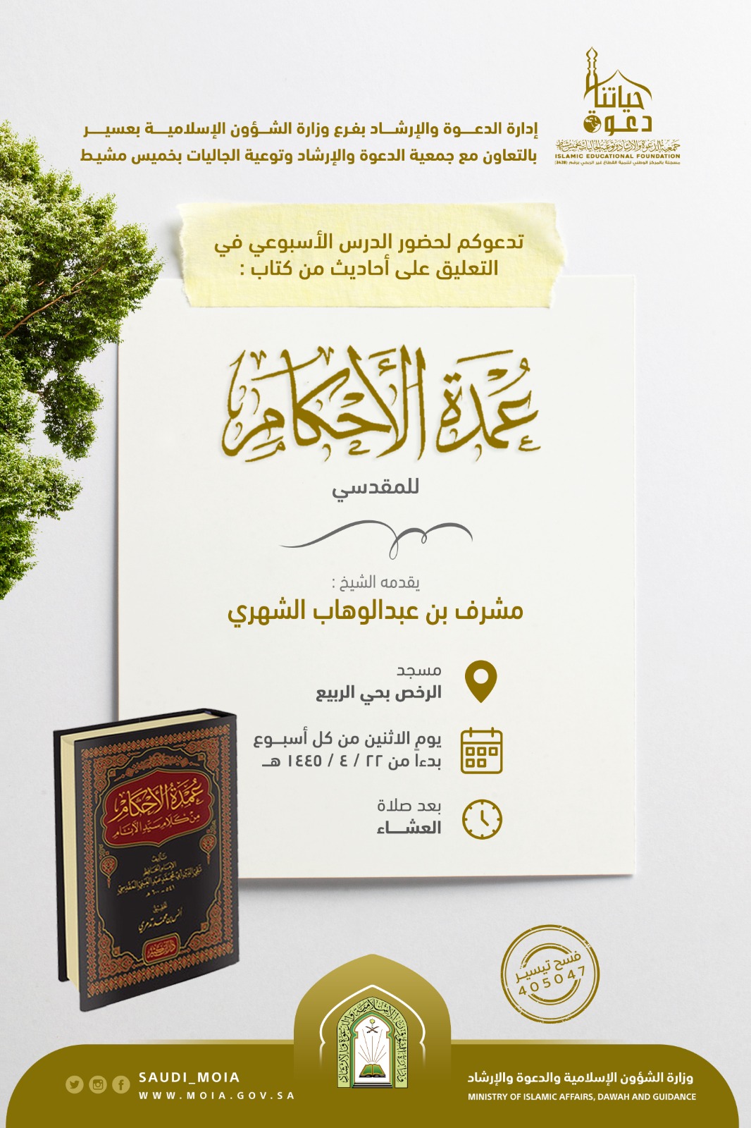 يسر إدارة الدعوة بفرع وزارة الشؤون الإسلامية بعسير بالتعاون مع جمعية الدعوة وتوعية الجاليات بخميس مشيط تدعوكم لحضور الدرس الأسبوعي في التعليق على أحاديث من كتاب عمدة الأحكام يقدمة الشيخ : مشرف عبدالوهاب الشهري بمسجد الرخص بحي الربيع يوم الاثنين من كل أسبوع بدءأً من 22/ 4/ 1445هـ بعد صلاة العشاء.