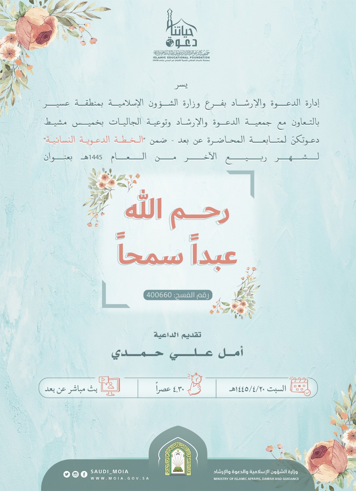 يسر إدارة الدعوة بفرع وزارة الشؤون الإسلامية بعسير بالتعاون مع جمعية الدعوة وتوعية الجاليات بخميس مشيط دعوتكنّ لمتابعة المحاضرة النسائية عن بعد بعنوان: رحم الله عبداً سمحاً تقدمها الداعية: أمل علي حمدي يوم السبت 20/ 4/ 1445هـ الساعة 4:30 عصراً بث مباشر عن بعد.