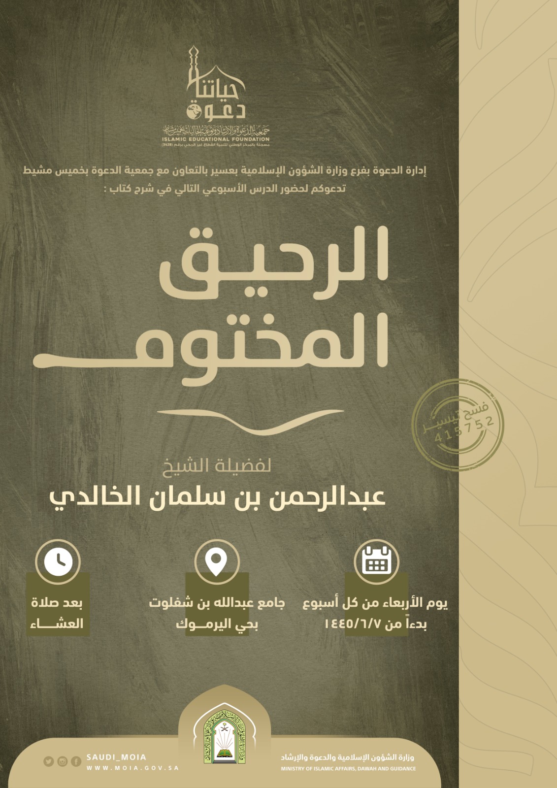 يسر إدارة الدعوة والإرشاد بفرع وزارة الشؤون الإسلامية بعسير بالتعاون مع جمعية الدعوة وتوعية الجاليات بمحافضة خميس مشيط تدعوكم لحضور الدرس الأسبوعي التالي في شرح كتاب الرحيق المختوم يقدمه الشيخ : عبدالرحمن بن سلمان الخالدي بجامع عبدالله بن شفلوت بحي اليرموك بعد صلاة العشاء يوم الأربعاء من كل أسبوع بدءاً من 7/ 6/ 1445هـ .